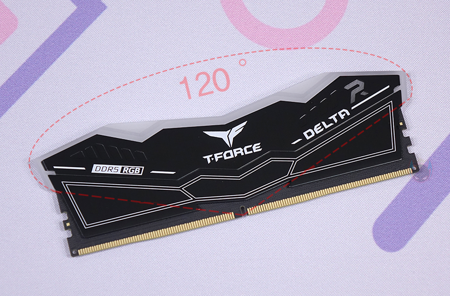 Teamgroup DELTA RGB DDR5 6400 CL40 메모리를 살펴보면, 색상은 블랙과 화이트 2가지 색상으로 출시되었습니다. 그리고, DELTA와 DELTAα 2가지 명칭으로도 구분이 되는데, DELTA는 인텔 XMP, DELTAα는 AMD EXPO 프로파일이 적용된 모델이며, 방열판 디자인이 조금 차이가 있죠. 그래도, 두 모델 모두 RGB 조명 영역이 120˚ 범위라는 것은 동일합니다.