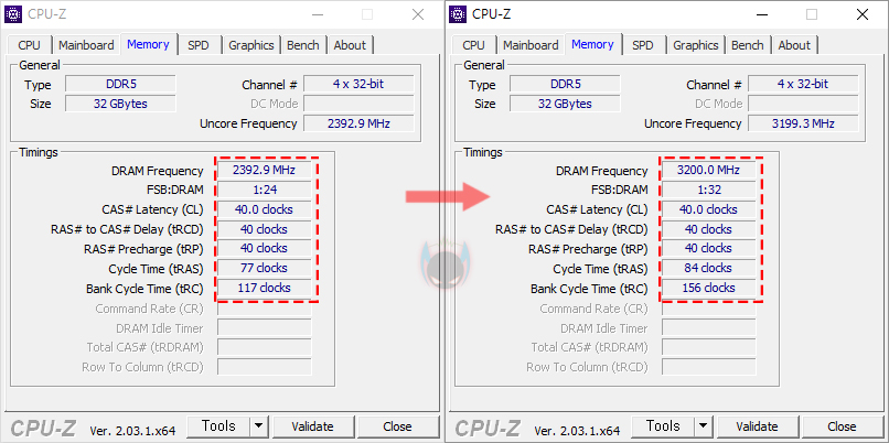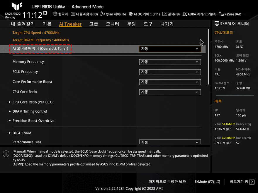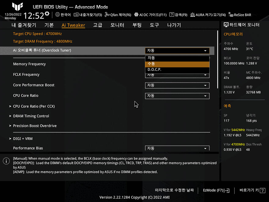 오히려, 이번 라이젠 7000 시리즈 CPU부터 지원하기 시작하는 DDR5 메모리의 오버클럭이 더 중요해졌다고 할 수 있습니다. 물론, AMD도 인텔처럼 오버클럭 설정값이 적용되는 EXPO 프로파일을 지원하는데, 인텔 XMP 프로파일이나 EXPO 프로파일 구분 없이, 오버클럭 설정값이 적용된 메모리는 모두 Ai Tweaker - Ai 오버클럭 튜너 메뉴에서 D.O.C.P를 선택하면 해당 메모리에 저장된 오버클럭 설정값 프로파일을 불러와서 바로 적용시켜 줍니다. 물론, 더 높은 오버클럭을 원한다면, 사용자가 수동으로 설정하면 됩니다.