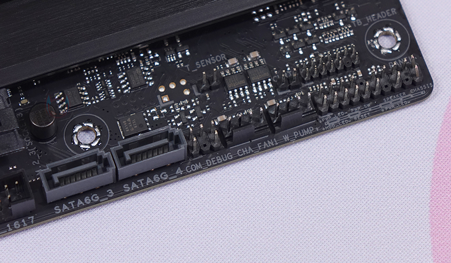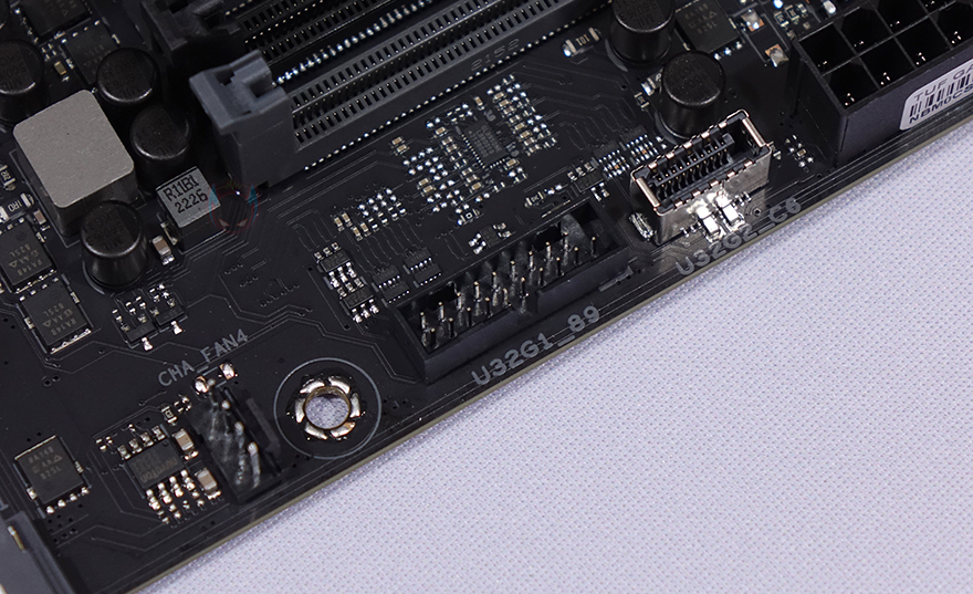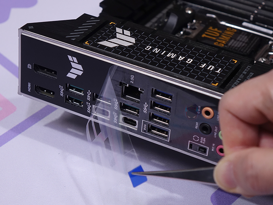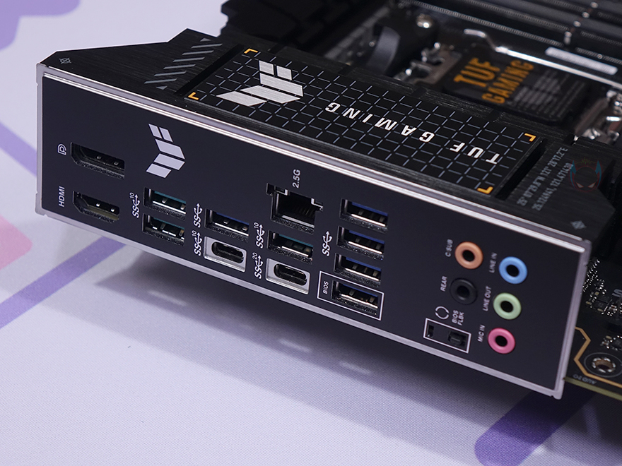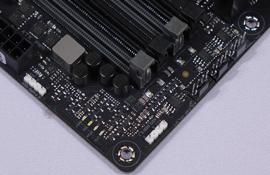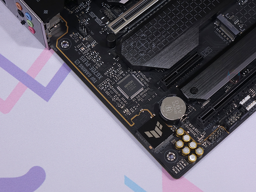 PCI 슬롯 맨 아래 그러니깐 메인보드 맨 아랫부분에는 PC 케이스 패널 케이블과 연결되는 헤더부터, 추가 PWM 팬 커넥터, S-ATA 커넥터, USB 2.0 내부 헤더, 5V ARGB 헤더, 12V RGB 헤더 등이 배치되어 있으며, 슬롯 맨 왼쪽에는 내장 오디오 자리로 독립 PCB 구간으로 분리해 놨으며, 오디오 EMI 실드와 일본 니치콘 캐패시터가 적용되어 있죠. 끝으로, 백패널 I/O 부분은 백패널 I/O 실드가 기본 장착되어 있으며, 역시 개봉 시에는 보호비닐이 부착되어 있습니다. 백패널 포트 구성에는 HDMI와 DP 모니터 출력 포트를 비롯해, USB 3.2 Gen 2(녹색) 포트 3개, USB 3.2 Gen2 Type-C 포트, USB 3.2 Gen2x2 Type-C 포트, USB 3.2 Gen 1 포트 4개, USB 3.2 Gen 1 BIOS FlashBack 포트, 2.5Gb 랜포트, 오디오 포트, BIOS FlashBack 버튼이 적용되어 있습니다.