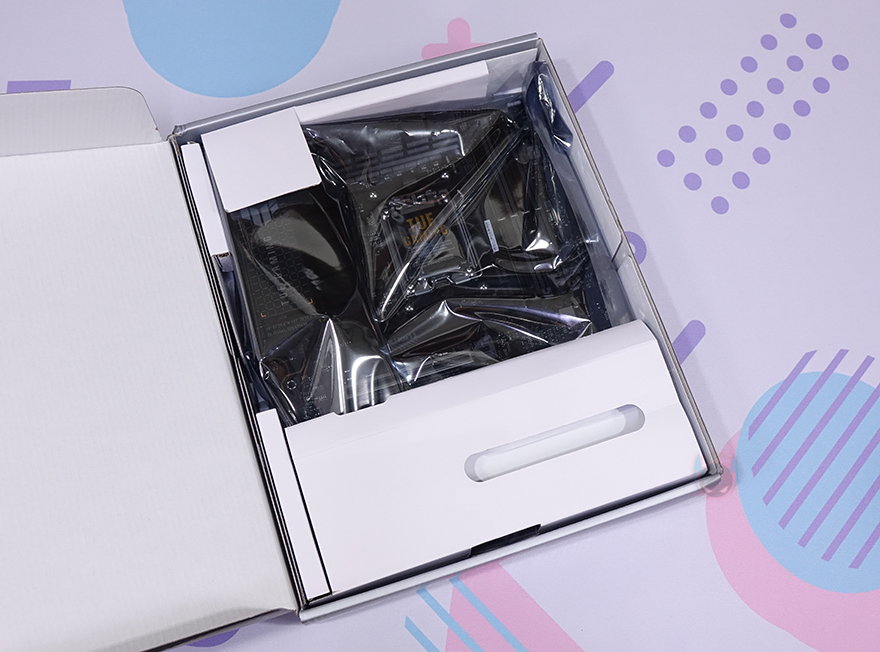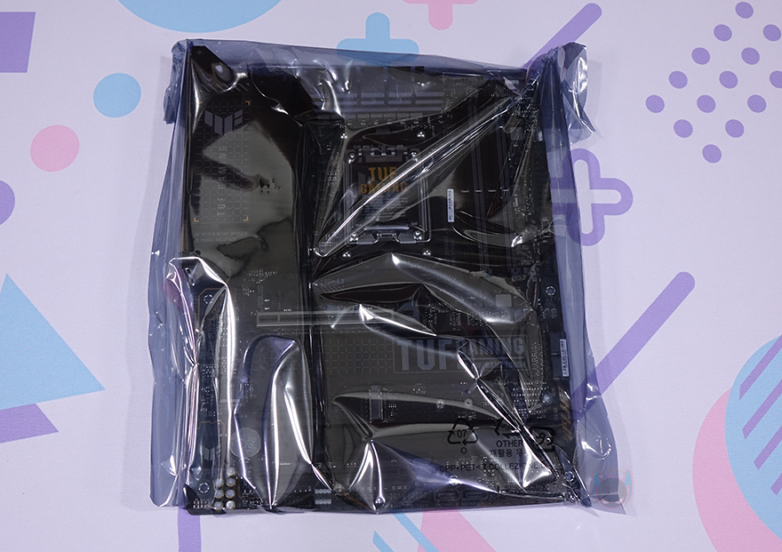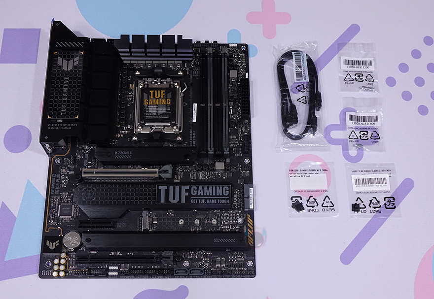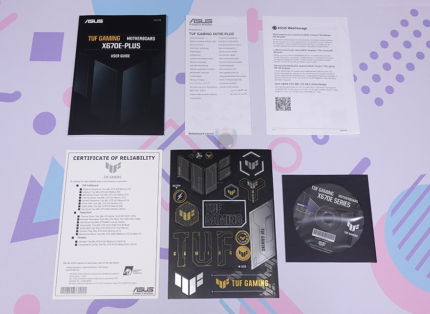 박스를 열어보면, 메인보드는 정전기방지 보호비닐에 기본 포장되어 있으며, 제품 구성은 TUF Gaming X670E-PLUS 메인보드, S-ATA 케이블 2개, M.2 NVMe SSD 장착에 필요한 나사 및 패드, 제품설명서 및 퀵 가이드, 그리고, TUF 라인업이기 때문에 미국방성 환경테스트를 통과한 랜가드/캐패시터/초크의 TUF 인증서, TUF Gaming 스티커, 드라이버 CD로 구성되어 있습니다.