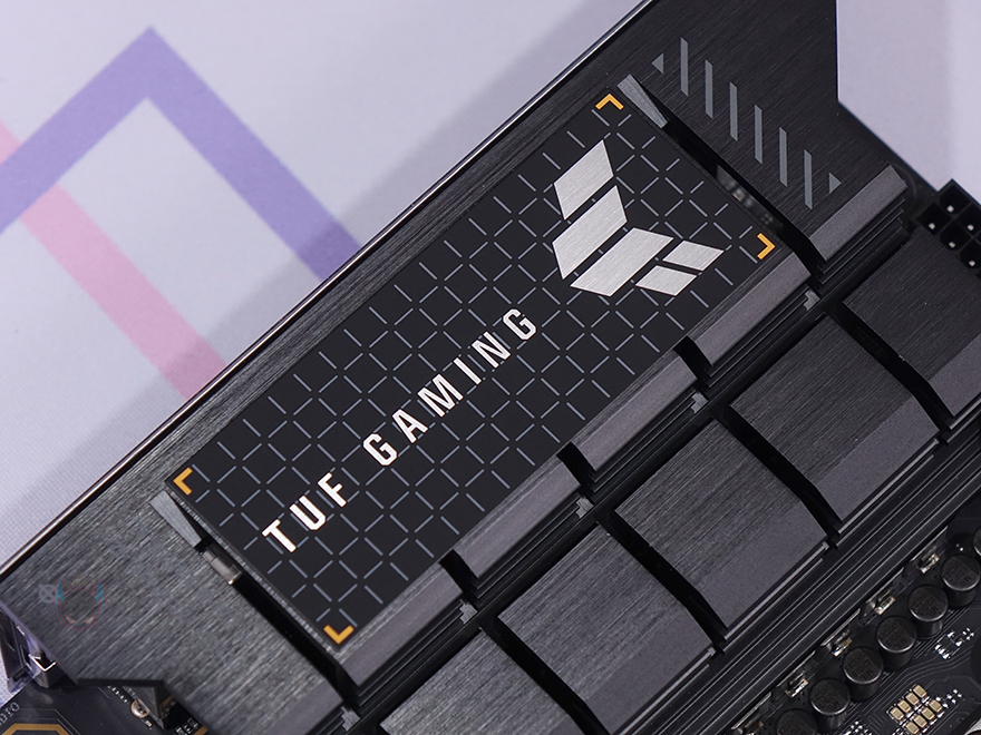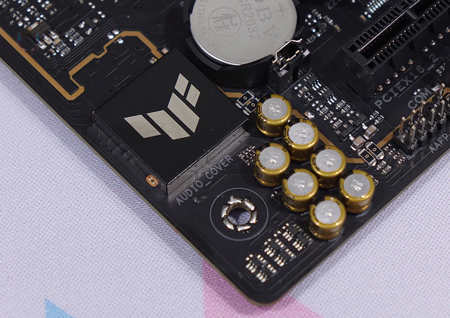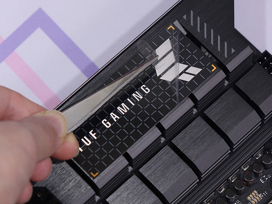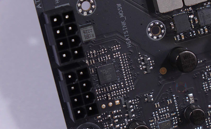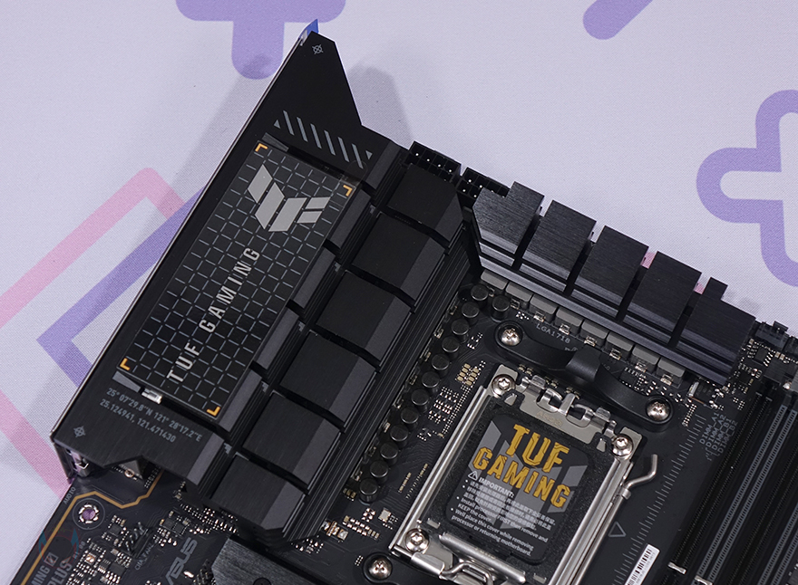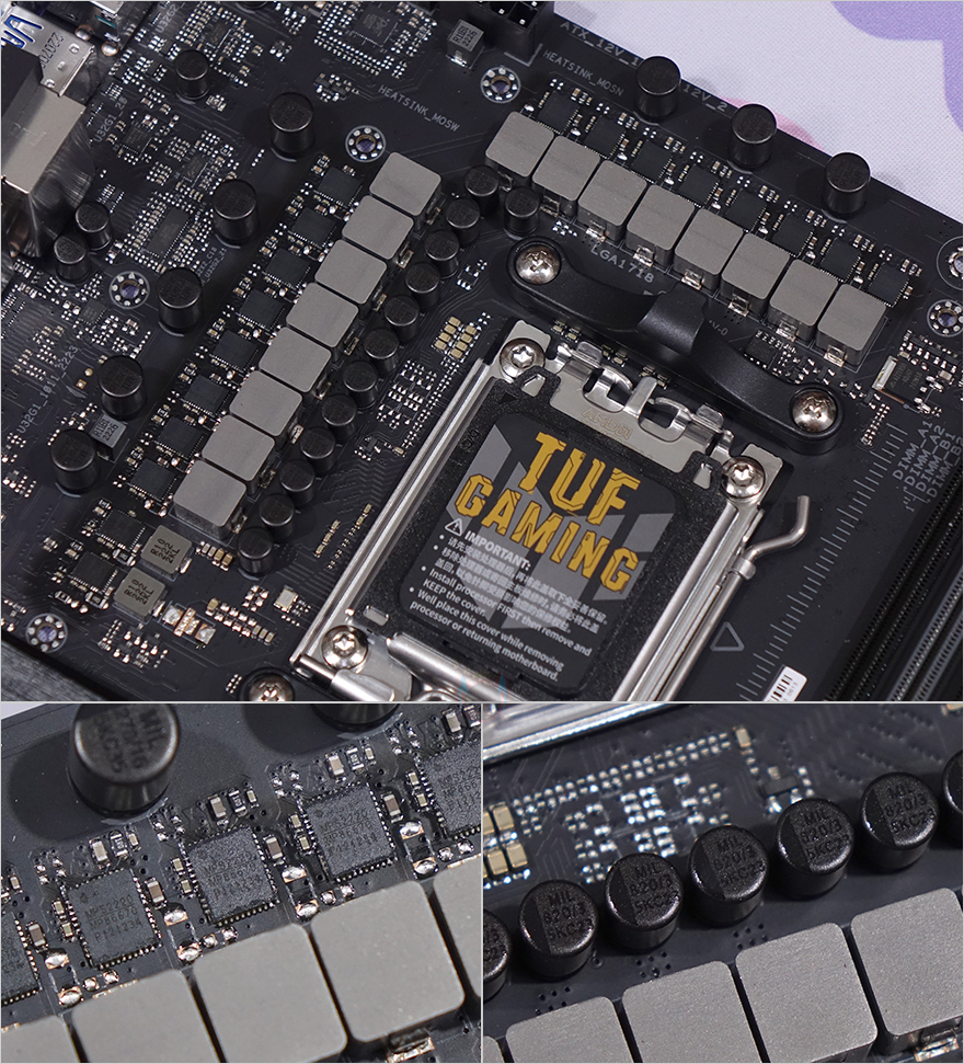 CPU 주변 전원부를 덮고 있는 히트싱크는 위쪽과 후면 쪽으로 각각 나뉘어 장착되어 있는데, 후면쪽 히트싱크는 백패널 내부까지 덮는 넓은 사이즈를 가지고 있으며, 개봉 시에는 로고 부분에 보호비닐이 부착되어 있습니다. 히트싱크를 분리해서 보면, 안쪽에 전원부의 초크와 모스펫 부분에 발열 해결을 위해 써멀패드가 부착되어 있으며, 전원부는 총 14+2 페이즈 구성으로 모스펫은 Dr.MOS로 디지털 전원부 구성이며 1 페이즈당 70A 전력과 초크와 캐패시터 모두 앞서 구성품에서 확인했듯이 미국방성 환경테스트를 거친 인증받은 부품이며, 캐패시터 같은 경우에는 표준 캐패시터보다 52% 더 높은 온도를 견딜 수 있으며, 2.5배 수명이 길다고 제조사에서 언급하고 있죠. 물론, 디지털 전원부인만큼 컨트롤칩셋도 ASUS Digi+ VRM이 적용되어 있고, 메인보드 보조전원 8핀도 2개로 갖추고 있어 오버클럭에 대한 전력 지원도 충분도 갖추고 있습니다.
