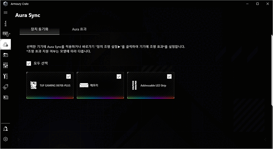 끝으로, TUF Gaming X670E-PLUS 메인보드에 제공되는 소프트웨어 중 TUF Gaming의 대표적인 프로그램 Armoury Crate를 잠깐 살펴보면, 일단 메모리나 그래픽카드, PC케이스 등 외부 RGB 조명 시스템구성을 생각한다면, 프로그램을 설치할 때, AURA Creator를 함께 설치하면 좋습니다. 설치 후 Armoury Crate 프로그램을 실행해 보면, 시스템 작동상태를 보여주는 대시보드를 비롯해 장치, 게임, 뉴스 등 다양한 메뉴가 있는데, 앞서 메인보드에 장착한 DDR5 메모리가 RGB Sync를 지원하는 제품이기 때문에, Aura Sync를 대표적으로 보겠습니다. 일단, 메모리가 Aura Sync와 연동이 되면, 기본 10가지 모드의 조명효과를 볼 수 있는데, 각 모드로 전환할 때마다 즉각적으로 반응하는 것을 확인할 수 있습니다.