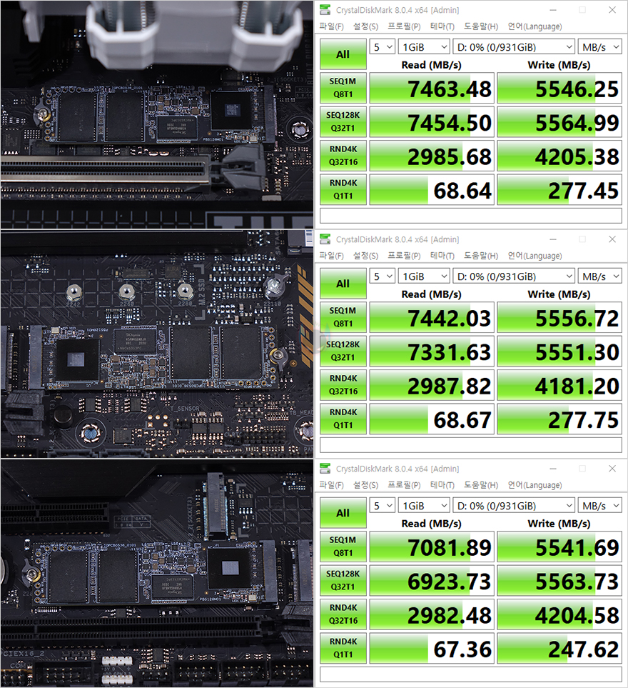 이번엔 M.2 NVMe SSD 슬롯 지원에 대한 성능을 확인해 보는데, 1번 슬롯은 PCIe 5.0을 지원하지만, 아직 시장에는 이를 지원하는 NVMe SSD가 없기 때문에, 현재 사용하는 최신 규격 PCIe 4.0 지원의 NVMe SSD로 1번 슬롯의 속도 성능을 확인해 보면, 장착한 SSD의 PCIe 4.0x4 규격으로 최대 속도를 발휘해 줍니다. 또한, 나머지 PCIe 4.0 지원 슬롯인 3번과 4번 슬롯에서도 동일한 결과를 보여주죠. 참고로 2번 슬롯은 PCIe 3.0까지 지원하기 때문에, PCIe 4.0 NVMe SSD를 장착해도 PCIe 3.0 규격 속도로 작동됩니다.