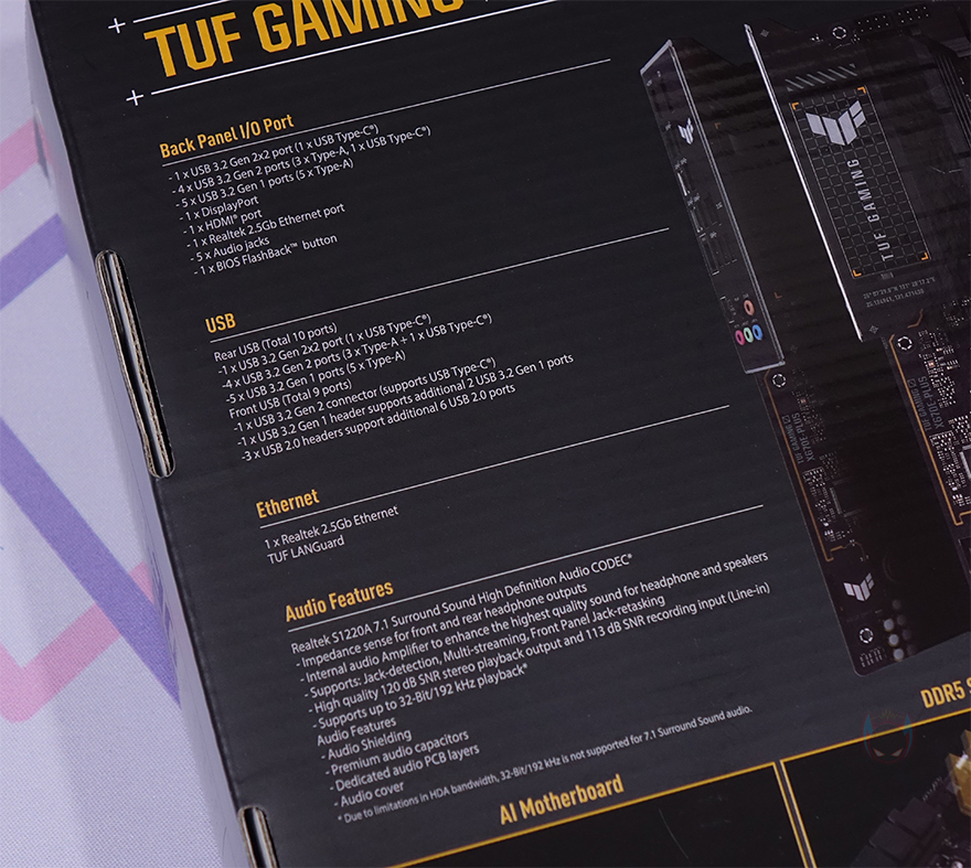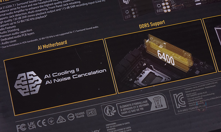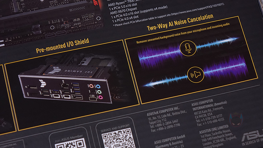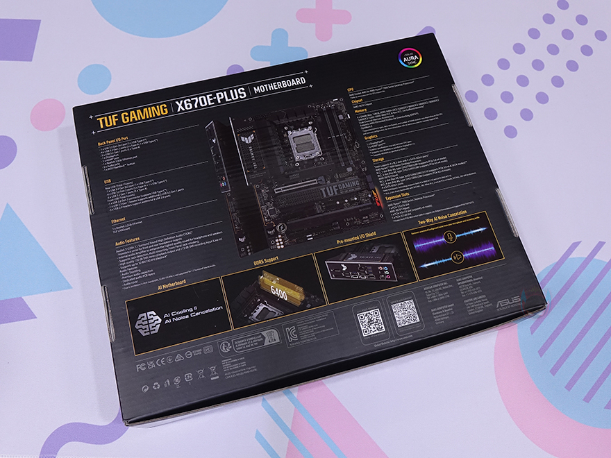 박스 뒷면도 ASUS의 기존 제품들처럼 해당 모델 메인보드의 풀-샷 이미지를 담으면서 지원 스펙 표기를 상세하고 있는데, 가운데 이미지를 기준으로 왼쪽은 포트별 지원을, 오른쪽은 CPU, 칩셋, 메모리, 저장장치, 슬롯 지원에 대한 정보를 얻을 수 있습니다. 이 외에도 최근 ASUS에서 강조하는 AI 기술(AI 쿨링, AI 노이즈 캔슬링)과 메모리 클럭, 사전설치된 백패널 I/O 쉴드도 주요 특징으로 표기해 놨습니다.