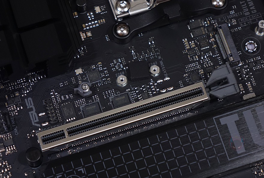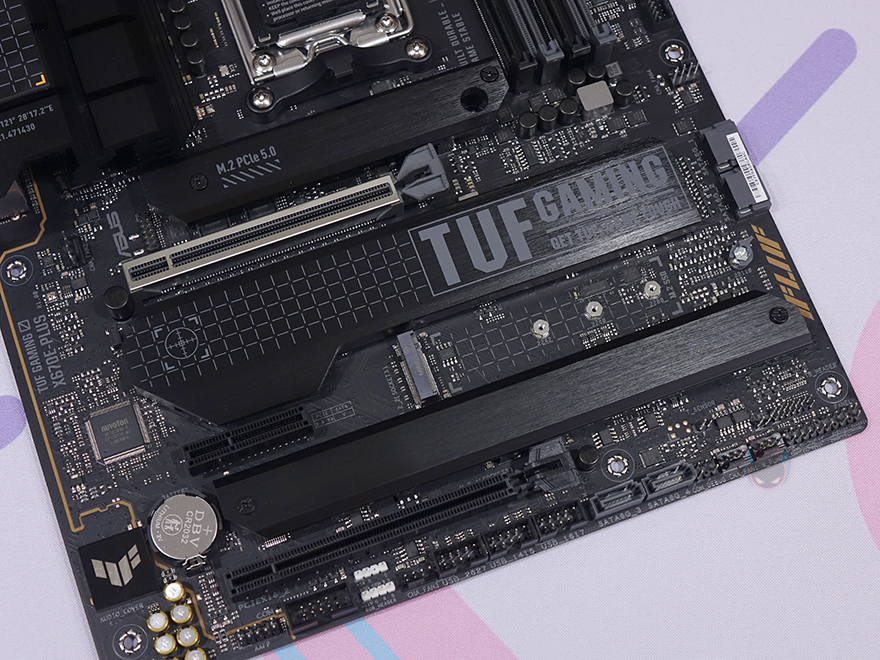 PCI 슬롯은 총 3개 구성이며, 슬롯 위아래 사이마다 히트싱크가 적용되어 있는데, 먼저 그래픽카드가 장착되는 1번 슬롯은 내구성 강화를 흔히 말하는 스틸 아머 디자인을 적용하고 있으며, 앞서 제품박스에서 확인했듯이, X670E 칩셋 메인보드이기 때문에 PCIe 5.0 규격을 지원합니다. 또한, 슬롯 위에 장착된 히트싱크 자리는 M.2 NVMe SSD 1번 슬롯 자리로 히트싱크를 분리하면, 2280 길이까지 장착할 수 있게 갖추고 있으며, 장착이 편리하도록 ASUS 특허인 Q-Latch로 적용된 것을 확인할 수 있습니다. 물론, 1번 슬롯이기 때문에 역시 PCIe 5.0 규격을 지원하고 있죠. 그리고, 중간에 장착된 히트싱크는 X670E 칩셋 자리이며, 그 아래에는 M.2 NVMe 2번 슬롯이 배치되어 있는데, 22110 길이까지 지원하며 역시 Q-Latch도 적용되어 있죠. 물론, 맨 아래 장착된 히트싱크 자리 역시 M.2 NVMe SSD 슬롯으로 히트싱크를 분리하면, 2개의 추가 슬롯은 확인할 수 있으며, 3번과 4번 슬롯이 되겠습니다. 참고로, 2버 슬롯은 PCIe 3.0 규격이고, 나머지 3번과 4번은 PCIe 4.0 규격이죠. 그리고, 3번과 4번도 2280 길이까지 장착할 수 있습니다.