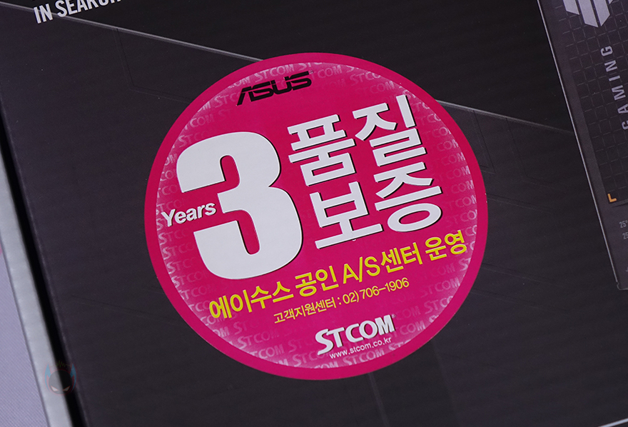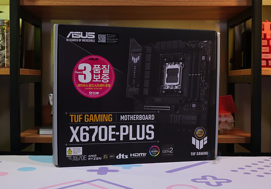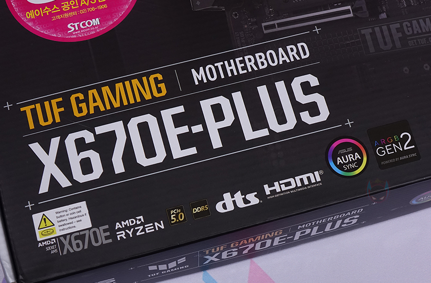 ASUS TUF Gaming 라인업의 메인보드 제품박스는 늘 한결같이 블랙 배경에 제품 이미지를 담는데, 이번 TUF Gaming X670E-PLUS 모델도 예외는 아니죠. 모델명과 함께 이번 라이젠 7000 시리즈부터 지원하는 DDR5 메모리와 PCIe 5.0 지원 표기를 확인할 수 있고, ASUS의 RGB 조명 기술인 AURA Sync 지원도 확인할 수 있습니다. 그리고, 내년이면 국내에 ASUS 메인보드를 유통한 지 24년이 되는 정식 수입사 STCOM(에스티컴)의 3년 품질보증 스티커도 확인할 수 있죠.