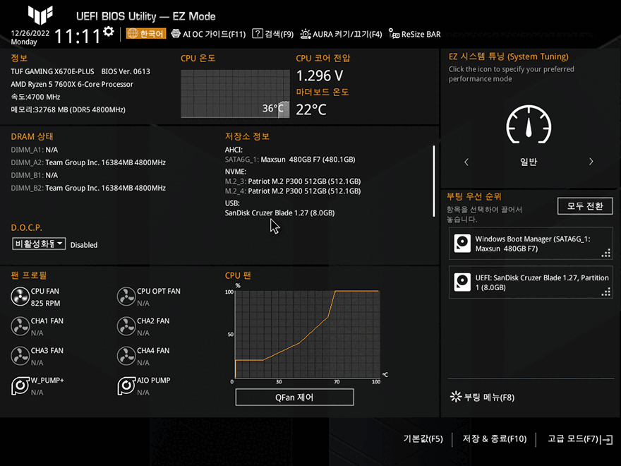 라이젠 7600X CPU 탑재와 팀그룹 T-Force Delta RGB DDR5 6400 CL40 메모리를 장착해서 시스템구성을 한 다음, TUF Gaming X670E-PLUS 메인보드의 CMOS의 바이오스(BIOS) 설정으로 들어가 보면, 인터페이스는 기존 TUF Gaming 메인보드에서 보던 디자인과 유사합니다. 그리고, 기본 EZ Mode에서 F7키를 누르면 Advanced Mode로 전환되는 부분도 동일한데, Advanced Mode로 들어가면, 메뉴는 크게 "기본/Ai Tweaker/고급/모니터/부팅/로고/나가기/내 즐겨찾기"로 구분되어, 역시 기본 구성은 기존과 큰 차이가 없습니다.
