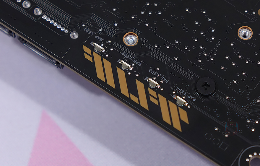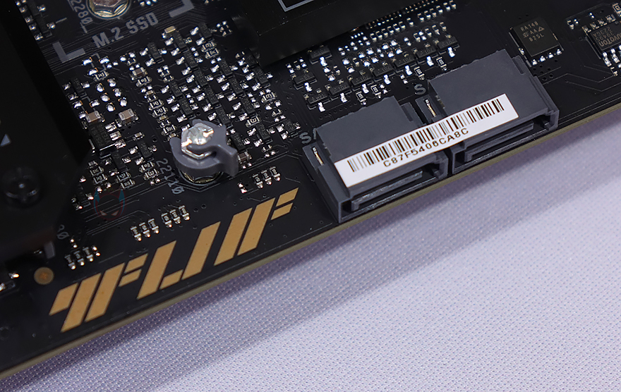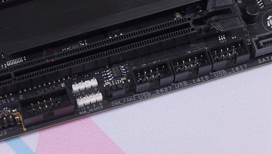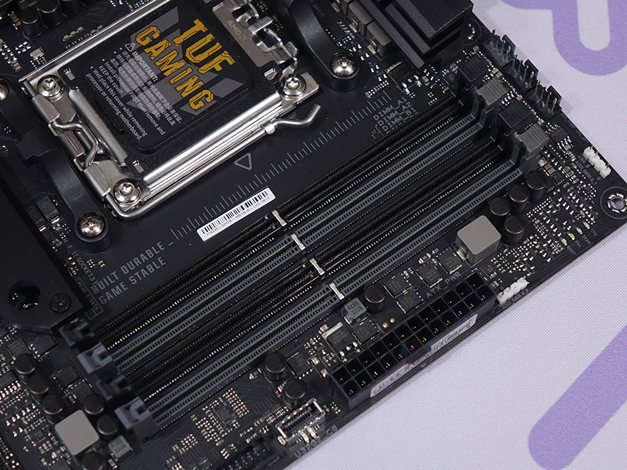 메모리 슬롯은 총 4개 구성으로 앞서 언급했듯이 AMD 라이젠 7000 시리즈 CPU부터는 DDR5 메모리를 지원합니다. 클럭은 DDR5 최소 클럭인 4800MHz부터 DDR5의 국민 오버클럭이라 할 수 있는 6400MHz 클럭과 그 이상으로 지원해주고 있으며, 용량은 최대 128GB까지 구성할 수 있죠. 메모리 슬롯 주변에는 윗부분에 PWM 팬 커넥터 3개와 5V ARGB 헤더 2개, 부팅 상태를 확인할 수 있는 Q-LED를 확인할 수 있으며, 아랫부분에는 USB 3.2 내부 헤더와 USB 3.2 Gen2 Type-C 커넥터, PWM 팬 커넥터 1개를 확인할 수 있습니다. 그리고, 그 아래로는 S-ATA 커넥터 2개와 TUF Gaming 라인업의 메인보드에서 빠지지 않는 PCB 기판 RGB 조명 효과 디자인도 확인할 수 있죠. 물론, PCB 기판 뒷면에 LED가 적용되어 있습니다.