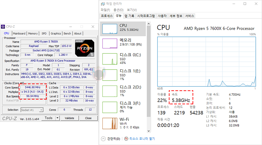 물론, X670E 칩셋 메인보드이기 때문에, CPU와 메모리 오버클럭 메뉴를 갖추고 있는데, 모두 Ai Tweaker 메뉴에서 진행할 수 있습니다. 다만, CPU 같은 경우에는 이번 AMD 라이젠 7000 시리즈가 기본 클럭과 부스터 클럭 모두 이전 세대의 CPU의 오버클럭 수율만큼 적용되어 있어서, 사실상 오버클럭 수율이 매우 낮아서, 기본설정으로 사용하기에도 충분합니다. 실제로, X670E-PLUS 메인보드에 장착된 라이젠 7600X CPU를 윈도우 운영체제상에서 작동되는 클럭을 보면, 부스터클럭(5.3GHz)보다 좀 더 높은 클럭까지 작동되는 걸 확인할 수 있어서, 굳이 오버클럭의 필요성은 크게 느껴지지 않습니다.