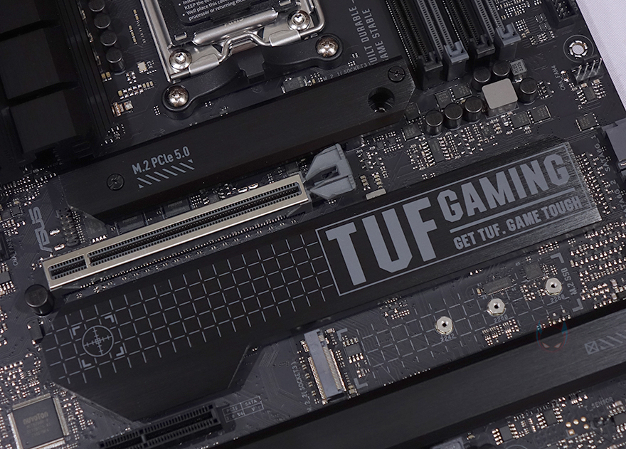 ASUS TUF Gaming X670E-PLUS 메인보드 레이아웃을 살펴보면, ATX 규격에 기존 TUF Gaming 메인보드 제품들처럼 이번에도 전반적인 블랙 계열 색상으로 디자인이 적용되었습니다. 그리고, 시작에서 언급했듯이 AMD의 X670E 칩셋 메인보드이기 때문에 라이젠 7000 시리즈 CPU 장착을 위해 새롭게 적용된 AM5 소켓을 확인할 수 있는데, 이전까지는 PGA 그러니깐 CPU에 핀이 박힌 형태였지만, 이번 라이젠 7000 시리즈 CPU부터는 인텔과 마찬가지로 소켓에 핀이 박힌 LGA 타입으로 바뀌었습니다. 그래서, 소켓 가이드 디자인이 최근 인텔 소켓 가이드와 유사하죠. 물론, 인텔과 AMD 서로 호환이 안되고, 이전 AMD 라이젠 5000 시리즈까지 CPU들과도 이제 호환이 안됩니다. 호환이 안된다고 해서 일부 소비자들이 아쉬워할 수 있지만, AMD가 2017년부터 AM4 소켓으로 5년 이상 유지하면서, 경쟁사 인텔이 여러 번 소켓 변경을 한 것을 생각하면, 아쉬워할 부분이 아니고, 이제는 반겨야 할 부분이 크죠.