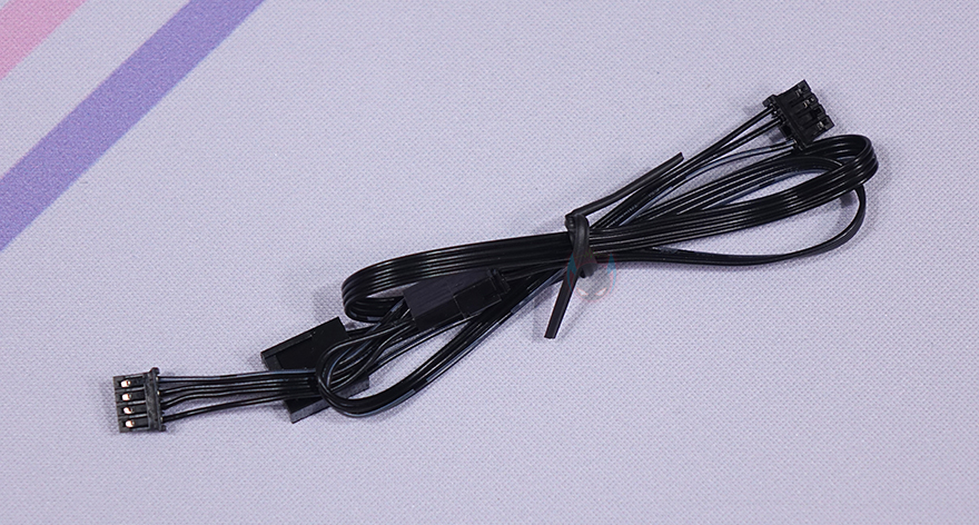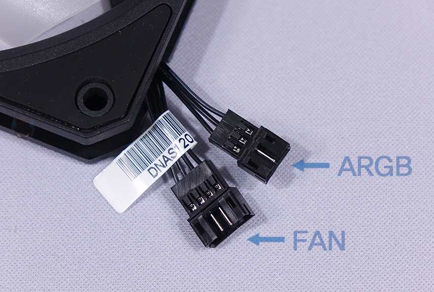 Air Slimmer 120 ARGB 팬은 두께 말고도 또하나의 특징이 있는데, 바로 케이블 연결 부분으로 슬림한 두께에 맞춰서 팬 케이블의 커넥터도 소형화로 적용되어 있으며, 2개의 커넥터 중 큰 거는 팬 커넥터, 작은 거는 ARGB 커넥터로 각각 제공되는 팬 케이블과 ARGB 케이블과 연결되죠. 먼저 팬 케이블 같은 경우에는 플랫(Flat) 타입으로 길이는 약 45cm이며, 메인보드와 연결되는 커넥터는 PWM(4Pin) 방식입니다. 그리고, 팬과 연결되는 부위는 팬 2개를 연결할 수 있게 분리형 연장케이블로 되어 있죠.