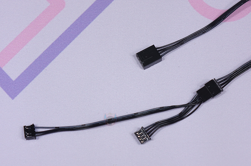 ARGB 케이블 역시 플랫(Flat) 타입이며, 길이는 약 50cm이고, 팬에 RGB 커넥터와 연결되는 케이블부분 역시 2개의 팬을 연결할 수 있게 분리형 연장케이블로 적용되어 있습니다. 그리고, 메인보드 RGB 헤더와 연결되는 커넥터는 5V ARGB 방식으로 적용되어 있죠. 또한, ARGB 커넥터 어댑터도 함께 제공해주고 있습니다.