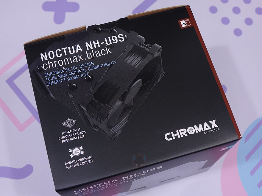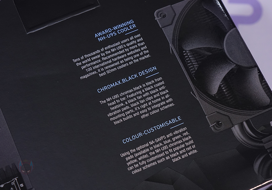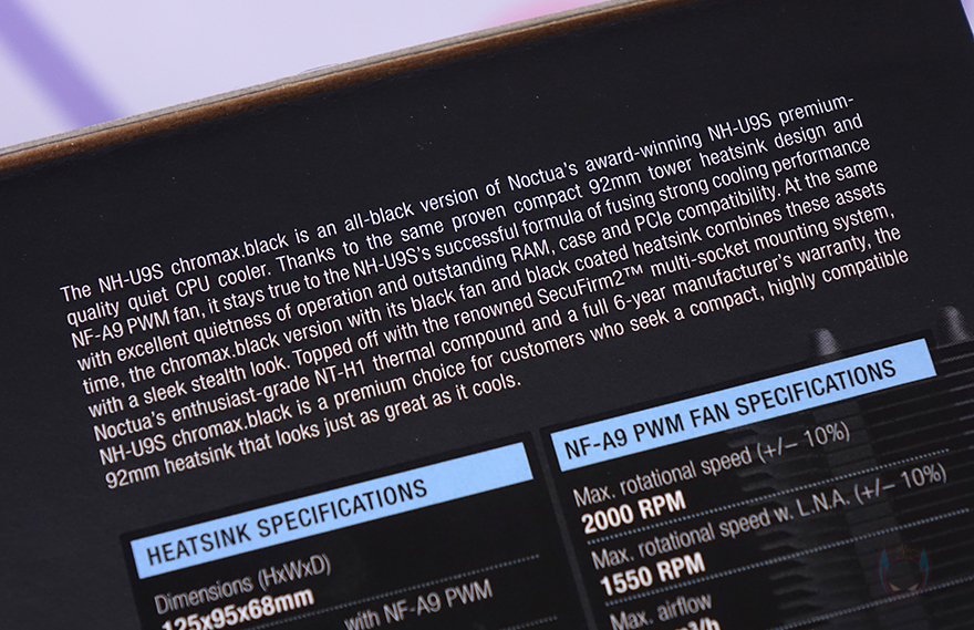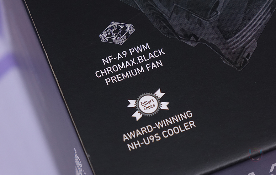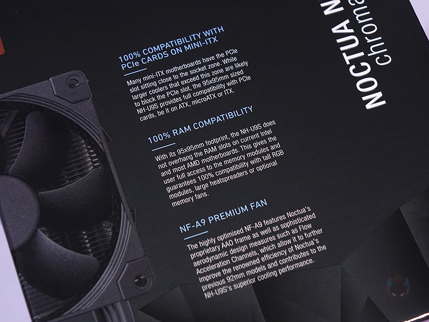 녹투아(Noctua)의 chromax.black 시리즈는 제품박스부터도 블랙색상으로 디자인되어 있죠. NH-U9S chromax.black 쿨러 역시 블랙색상 배경에 해당 제품의 이미지를 담고 있으며, 모델명과 함께 메모리와 그래픽카드 간섭이 전혀 없고, 92mm 팬이 장착되었다는 문구를 전면에서 확인할 수 있습니다. 물론, 박스 상단에도 동일한 문구와 함께 추가로 92mm 팬은 NF-A9 PWM 모델의 chromax.black 버전이라는 것도 추가로 확인할 수 있습니다. 그리고, 측면에도 이런 특징을 상세하게 소개하고 있습니다.