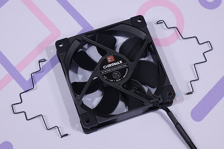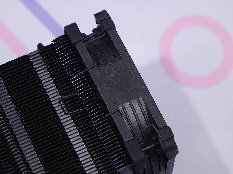 전면에 기본 장착된 92mm 팬은 앞서 제품박스에서 확인했듯이 기존 NF-A9 PWM 팬을 chromax.black 제품에 맞춰 역시 NF-A9 PWM chromax.black 모델로 출시한 팬을 적용했으며, 날개와 프레임뿐만 아니라 방진패드와 팬 클립까지도 블랙색상입니다. 물론, 팬 클립을 분리하면 쉽게 쿨러에서 분리가 되죠. 또한, 앞서 구성품에서 확인했듯이 추가 팬 클립까지 제공해주고 있기 때문에, 듀얼-팬 구성도 가능합니다.