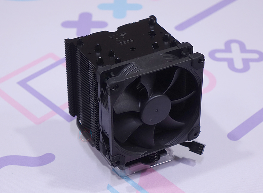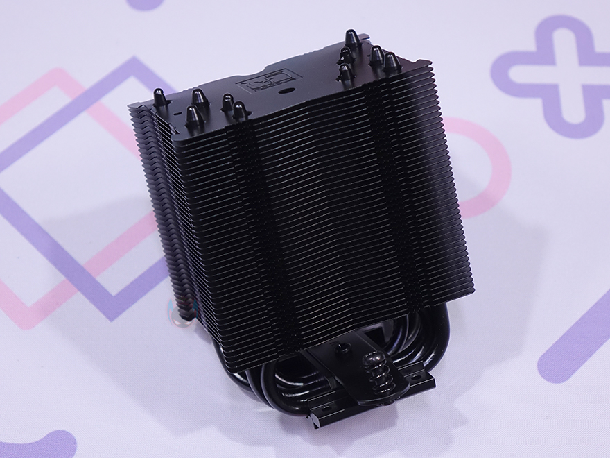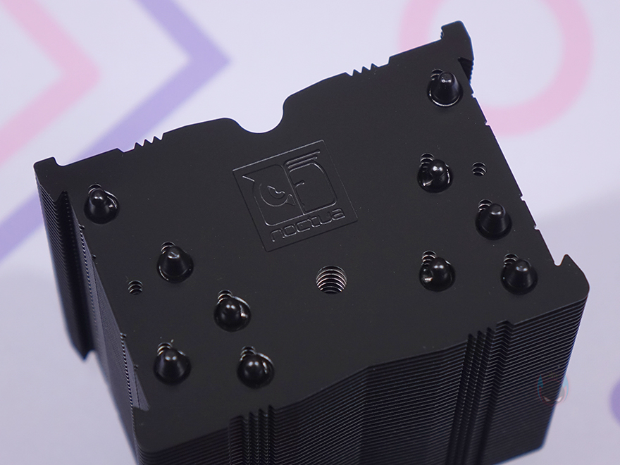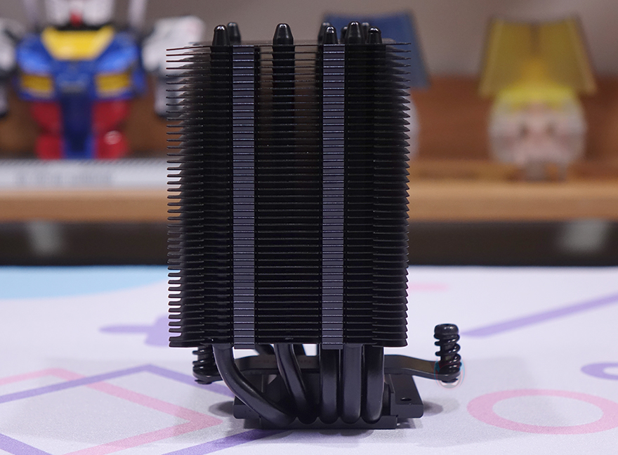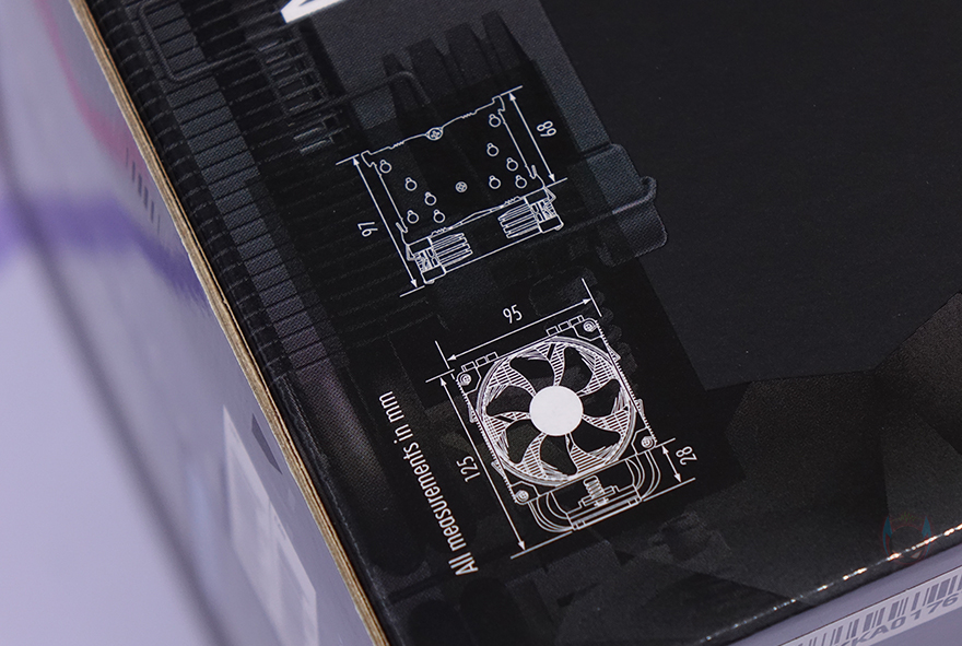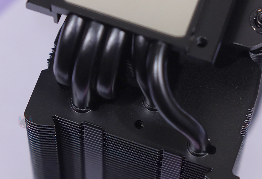 NF-A9 PWM chromax.black 팬을 분리한 상태에서 NH-U9S chromax.black의 히트싱크만 살펴보면, 방열핀과 히트파이프 모두 블랙 색상으로 도색되어 있으며, 방열핀에는 로고(Logo)도 새겨져 있죠. 방열핀은 총 43개가 적용되어 있으며, 히트파이프는 지름 6mm로 총 5개가 적용된 U자형 구조입니다. 그리고, 방열핀과 히트파이프 관통은 솔더링 방식이며, CPU와 맞닿는 베이스부분은 깔끔하게 래핑처리되어 있죠. 참고로, 팬까지 장착되었을 때 쿨러의 깊이는 93.5mm이고, 폭은 95mm, 높이는 125mm입니다.