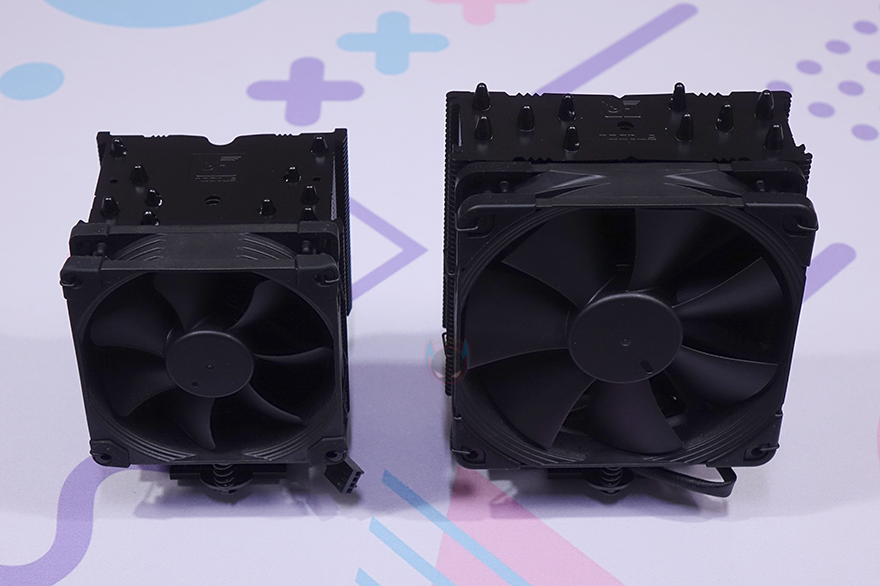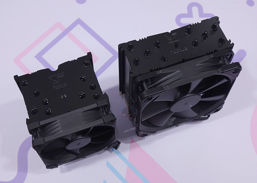 그럼, 녹투아(Noctua) NH-U9S chromax.black 쿨러를 본격적으로 살펴보면, 일단 chromax.black 라인업답게 올-블랙(All-black) 색상을 가지고 있습니다. 기존의 NH-U9S 기본모델과 비교하면 확연한 차이를 보이면서 블랙색상이 주는 고급스러운 느낌도 추가되었죠. 그리고, 120mm 모델의 NH-U12S chromax.black 쿨러와 비교해보면, 92mm와 120mm의 크기 체감도 쉽게 확인이 됩니다. 높이나 폭은 확실히 120mm보다 작아도, 방열핀 면적은 92mm로써 쿨링효과를 높이기 위해서 120mm보다 넓을 수밖에 없죠.