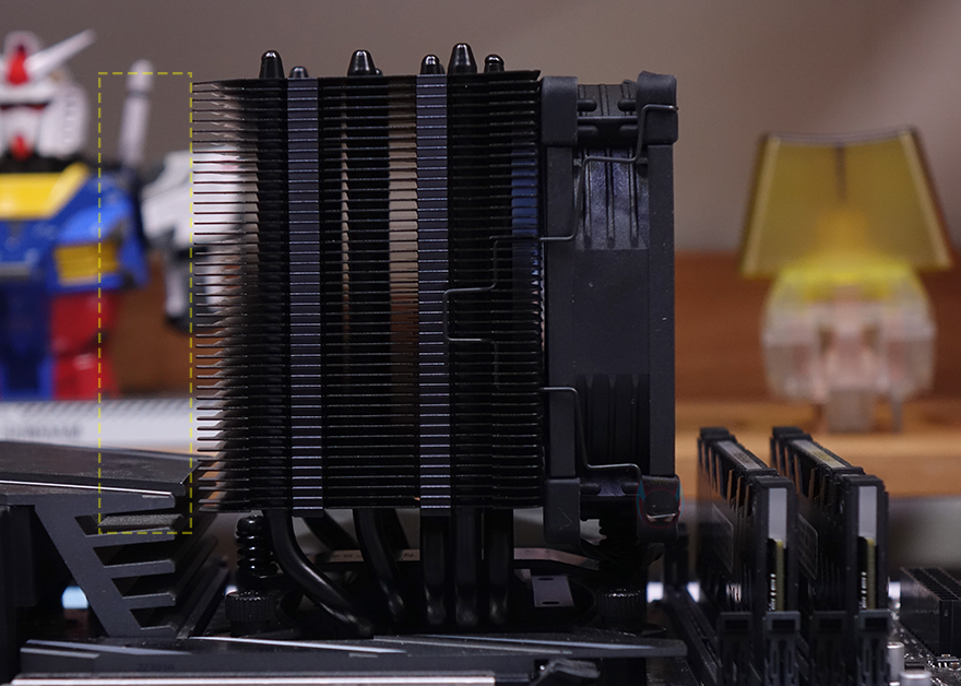 녹투아(Noctua) NH-U9S chromax.black 쿨러의 성능을 확인해보기전에 장착부터 시작해 보면, 92mm 쿨러지만, 장착은 자사의 120mm나 140mm 쿨러 제품들과 동일합니다. 인텔 LGA 115x 기준으로 장착법을 설명하자면, 먼저 인텔용 백플레이트를 메인보드 후면에서 끼운 후, 와셔를 올려줍니다. 그리고, 그 위에 마운팅을 올려주고, 볼트로 고정해준 다음, 팬을 분리한 상태의 NH-U9S chromax.black 히트싱크를 올려서 마운팅과 체결해주면 기본 장착이 끝나고, 마무리로 다시 팬을 장착해주면 되죠. 장착은 초보자도 쉽게 할 수 있을 정도로 어렵지 않으며, 장착 후 메모리 슬롯 간섭여부를 확인해 보면, 92mm 쿨러이기 때문에 팬을 장착한 상태에서도 간섭이 없는 것을 확인할 수 있습니다. 다만, 쿨러 후면 같은 경우에는 요즘 나오는 중/보급형 메인보드들은 널찍한 히트싱크를 갖추고 나오는 제품들이 많아서, 이런 경우에는 듀얼-팬 구성이 어렵기 때문에 메인보드의 히트싱크 크기를 고려해야 하겠습니다.