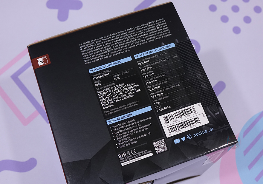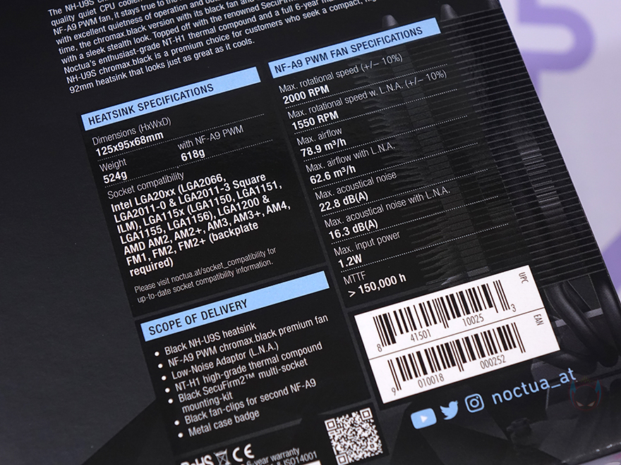 물론, 한쪽 측면에는 다른 chromax.black 제품들처럼 NH-U9S chromax.black의 소개문구와 제품의 히트싱크와 팬에 대한 상세한 기본 사양 표기와 제품 구성목록 표기도 해놨으며, 제품 사이즈 표기도 담겨져 있습니다. 구입 전에 소비자가 정보를 충분히 얻을 수 있을 만큼 많은 양의 정보를 제품 박스에 담는 것도 녹투아만의 특징이기도 하죠.