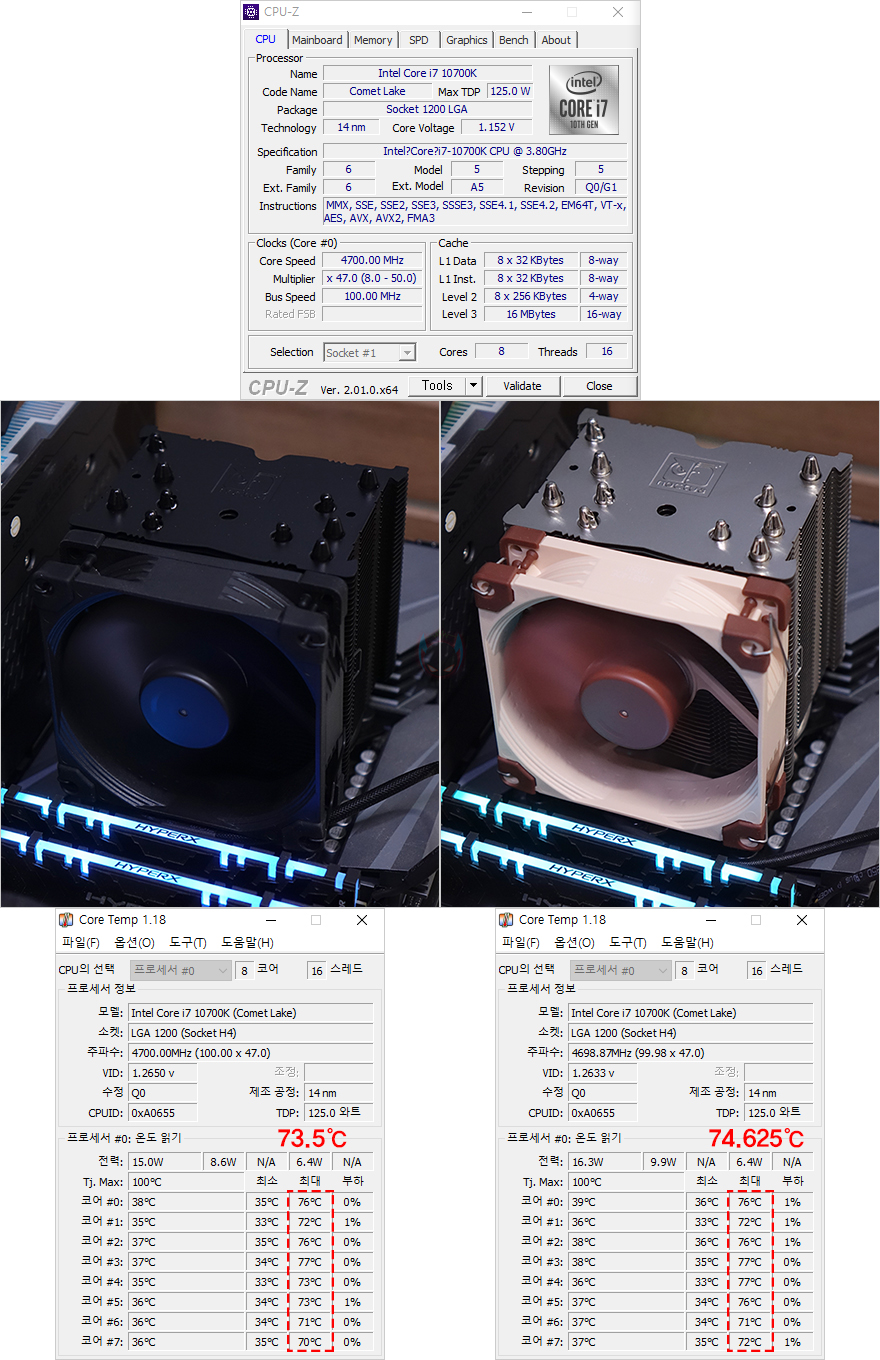 이제, 녹투아(Noctua) NH-U9S chromax.black 쿨러의 성능을 확인해 보는데, 92mm 쿨러이기 때문에 높은 오버클럭보다는 전력해제 수준의 오버클럭에서 기존 NH-U9S 기본 모델과 온도차이를 비교해 봤습니다. 인텔 i7-10700K를 4.7 GHz 오버클럭한 상태에서 100% Load 상황 10분 동안의 두 모델의 CPU 온도를 비교했을 때 기본 모델은 74.625℃, NH-U9S chromax.black은 73.5℃로 기본모델보다 조금 더 나은 쿨링 성능을 보여줍니다.