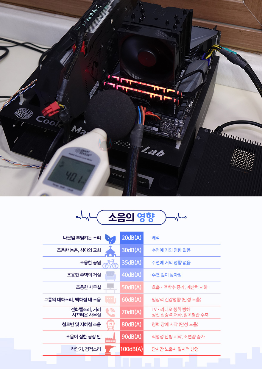 끝으로, 과부하 상태에서 NH-U9S chromax.black 쿨러에 장착된 NF-A9 PWM chromax.black 팬은 2000 RPM대로 작동했는데, 10cm 거리를 두고 소음 측정해 본 결과, 약 40dB(A)로 생활 소음 기준으로 봤을 때, 정숙한 편에 속하는 것을 확인할 수 있습니다.