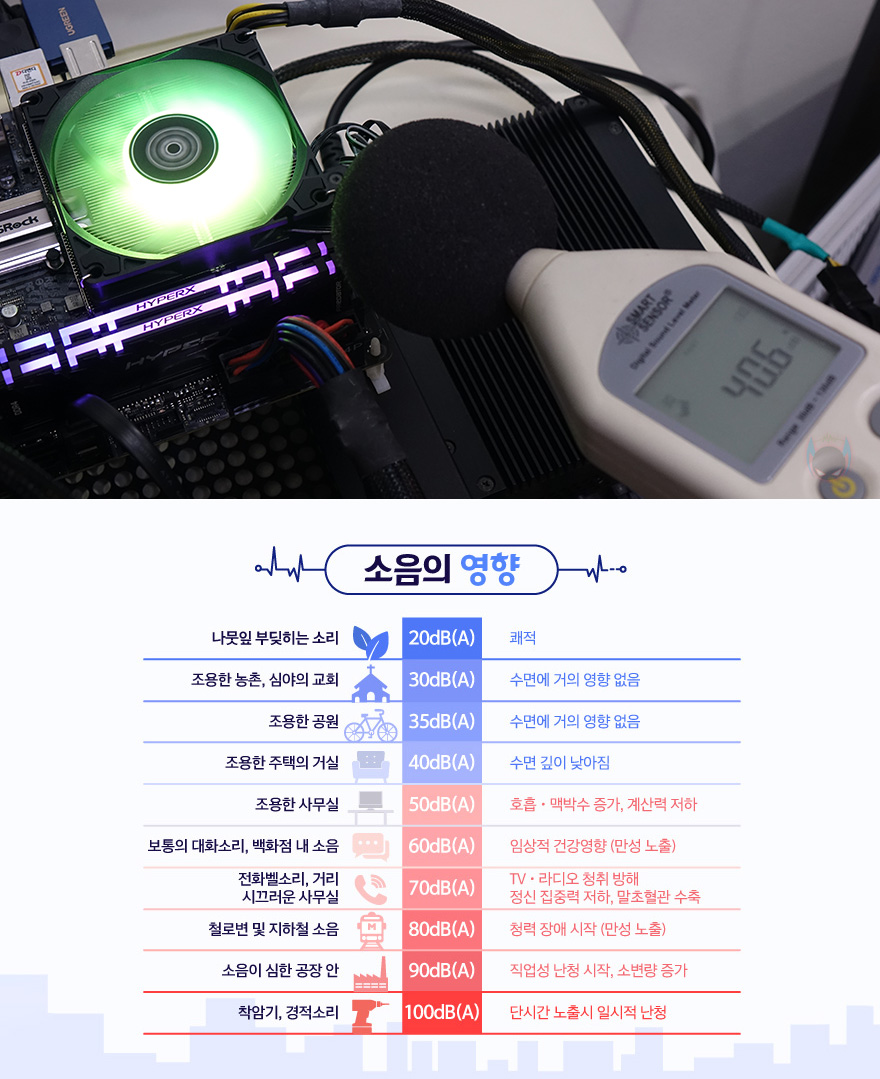 실버스톤 Hydrogon H90 ARGB 쿨러의 쿨링 성능을 확인해보면, 일단 로우-프로파일 쿨러이고, 92mm 팬을 장착하고 있기 때문에 이와 가장 비슷한 Noctua의 NH-L9i 쿨러와 비교를 했는데, 인텔 i7-10700K를 전력해제만 한 상태에서 100% Load 상황에서 온도를 비교해 본 결과, Hydrogon H90 ARGB 쿨러가 더 낮은 온도를 보여줘서 쿨링 성능이 더 낫다라는 것을 확인할 수 있습니다. 그리고, 과부하 시 팬 소음도 측정해 봤는데, 약 40dB(A) 수준으로 생활소음기준과 비교하면 정숙한 편에 속한 다라는 것도 확인할 수 있죠. 물론, PC케이스 내부에 장착되면 이보다 좀 더 낮은 소음으로 들립니다.