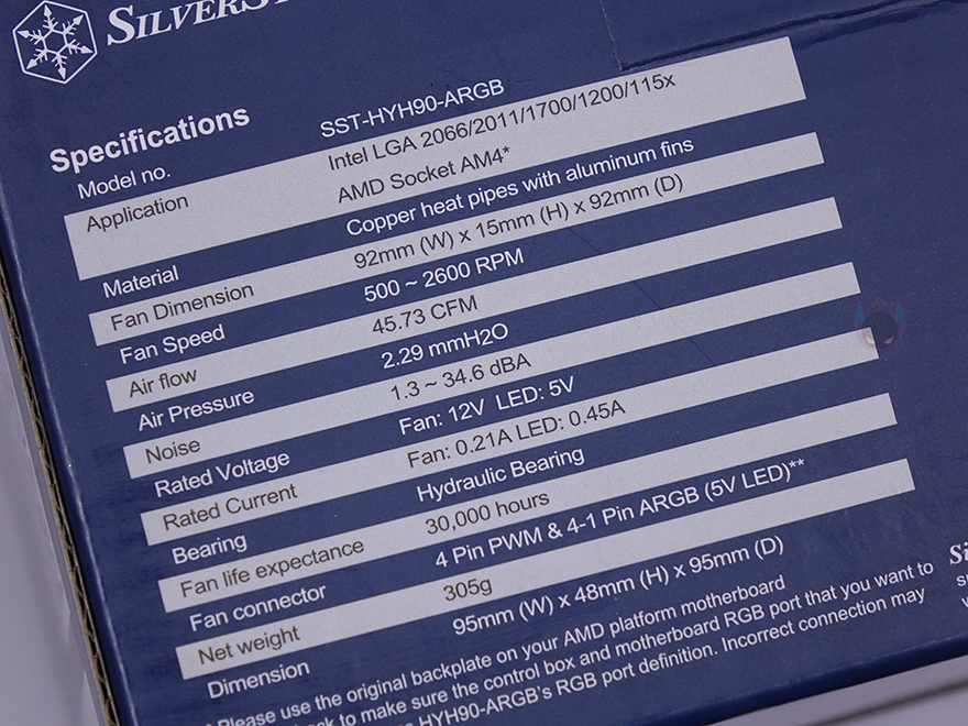 실버스톤(Silverstone) Hydrogon H90 ARGB 쿨러를 살펴보면, 일단 로우-프로파일 쿨러이기때문에 측면에서 보면 높이가 48mm로 낮으며, 팬은 92mm 사이즈가 장착되어 있는데, 클립방식으로 장착되어 있어서 쉽게 분리할 수 있습니다. 팬 날개(Blade)는 총 11개를 가졌고, 각 모서리 부근에는 방진 패드가 적용되어 있죠. 그리고, 팬 후면에 모델명을 확인할 수 있는데, 사용된 팬은 Air Slimmer 시리즈 모델이며, 다음 시간에 별도로 판매되는 Air Slimmer 90 ARGB 팬을 따로 만나볼 텐데, 로우-프로파일 쿨러 콘셉트에 맞췄기 때문에 팬 두께도 일반 25mm가 아니고 15mm 슬림형입니다. 그리고, 메인보드 RGB Sync 연동을 위해 ARGB 케이블을 갖추고 있으며, 커넥터 2개를 갖추고 있어서 연장 연결도 가능합니다. 팬 작동 연결방식은 당연히 PWM(4 Pin) 방식이죠. 참고로 팬 속도 범위는 500~2600 RPM입니다.