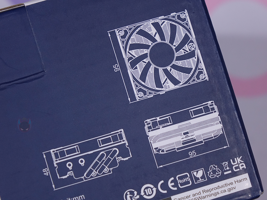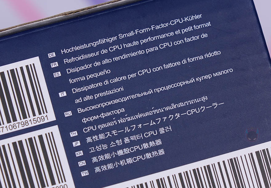 제품박스는 로우-프로파일 쿨러이기때문에 작은 편이며, 전면에 제품 이미지와 함께 모델명, 그리고 그 아래에 Small Form Factor CPU 쿨러라는 문구를 확인할 수 있습니다. 예전엔 로우-프로파일 쿨러라고 많이 불렀지만, 요즘은 미니 PC를 SFF PC로 부르는 경우가 많아지다 보니 로우-프로파일 역시 SFF 쿨러로 부르는 경우가 많아졌죠. 그리고, 문구아래에는 각 메인보드 제조사들의 RGB Sync 연동 지원을 확인할 수 있습니다.
