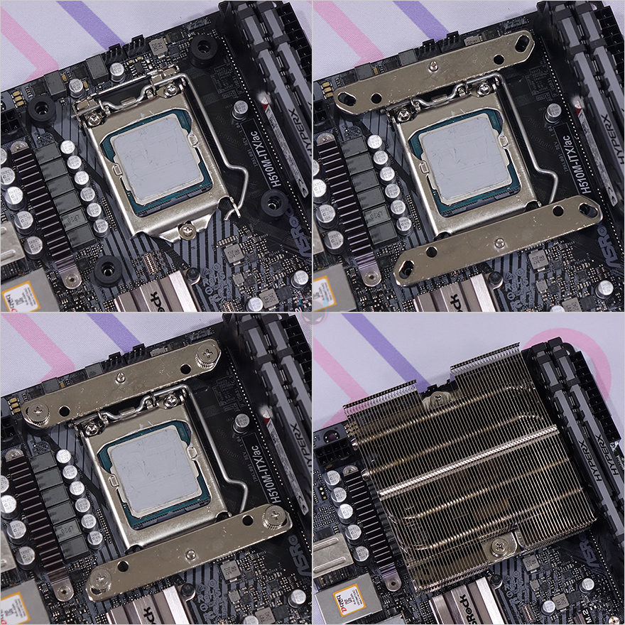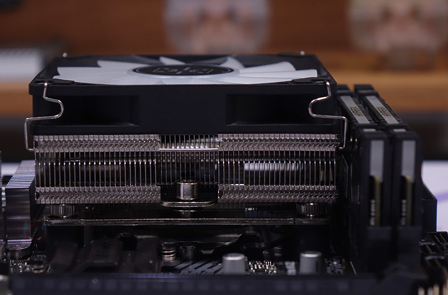 실버스톤 Hydrogon H90 ARGB 쿨러의 성능을 확인해보기 전에 장착부터 해야하는데, 장착 같은 경우 AMD는 메인보드에 기본 장착되어 있는 백플레이트를 그대로 사용하면 되고, 인텔 같은 경우에는 LGA 115x/1200 소켓과 LGA 1700 소켓용 백플레이트를 각각 제공해주고 있어서 사용자 CPU 소켓에 맞춰서 선택해 메인보드 후면에 끼워줍니다. 그리고, 와셔 역시 표기된 소켓용 와셔를 뜯어서 메인보드에 올려주고, 마운트를 올린 후 볼트로 백플레이트와 체결해주면 되죠. 그다음 Hydrogon H90 ARGB 히트싱크를 올려서 마운트와 체결하고 마무리로 다시 팬을 장착해주면 됩니다. 원래 로우-프로파일 쿨러가 장착이 쉬운 편이라 초보자도 쉽게 할 수 있는 난이도이며, 장착 후 메모리슬롯 간섭을 확인해보면 약 1mm정도의 여유공간으로 간섭이 발생하지 않는 것을 확인할 수 있습니다.