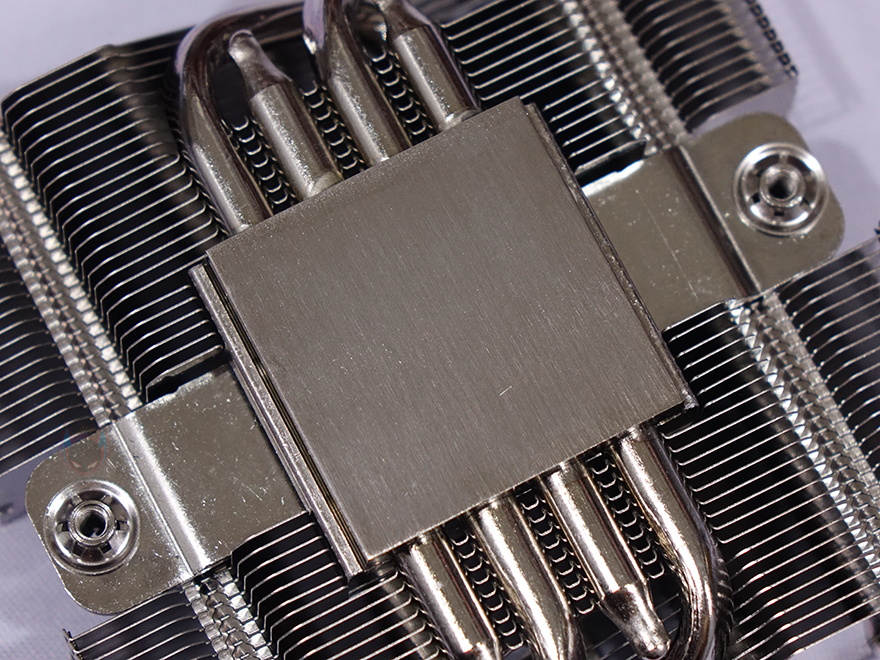 팬을 분리한 상태에서 Hydrogon H90 ARGB 쿨러의 히트싱크만 살펴보면, 방열핀은 총 61개 사용되었으며, 방열핀을 통과하는 히트파이프트는 지름 6mm에 총 4개가 사용되었고, 통과는 솔더링방식이며, 사선방향 U자 구조로 적용되었습니다. 일단, 로우-프로파일에서 히트파이프 4개면 준수한 개수죠. 그리고, CPU와 맞닿는 베이스 부분도 매끄럽게 잘 래핑처리되어 있습니다.
