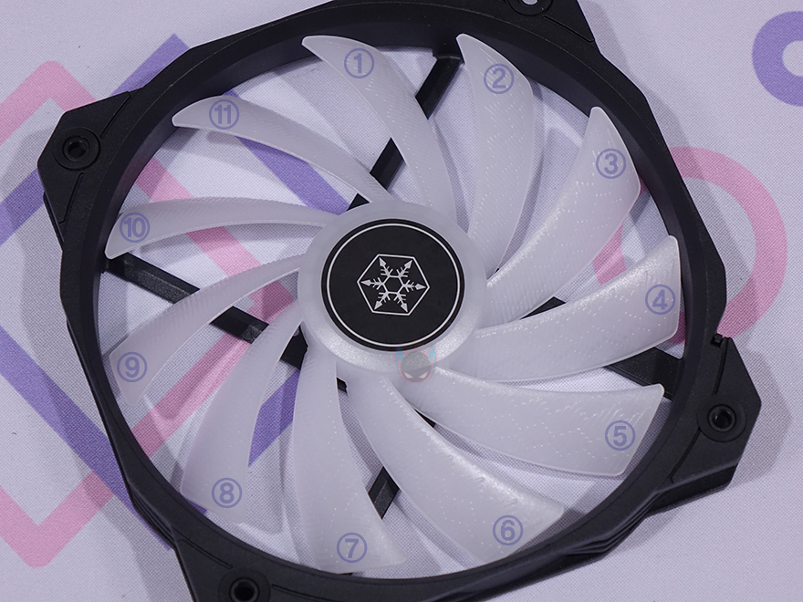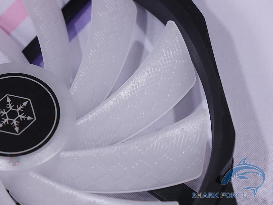 실버스톤 Shark Force 160 ARGB 팬을 살펴보면, 일단 팬 날개(Blade)는 11개로 160mm 사이즈치고는 많은 편입니다. 아무래도 이렇게 팬 날개를 많이 가지고 있으며 풍량이 높아지죠. 물론 여기에 앞서 제품 박스에서 잠깐 언급했던 Shark Force 디자인이 날개에 적용되어 있습니다. 가까이서 보면 양각 형태로 일정 패턴을 가진 것을 확인할 수 있죠.