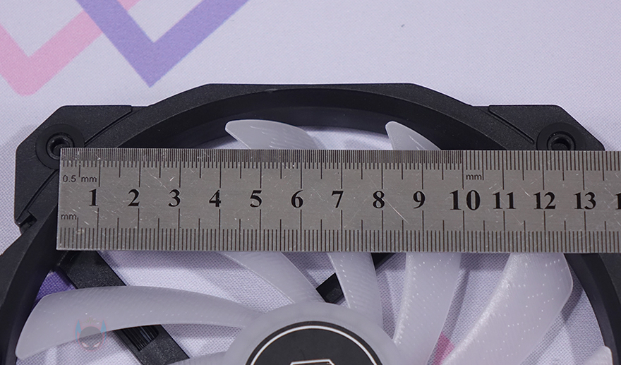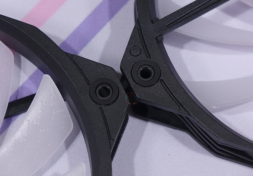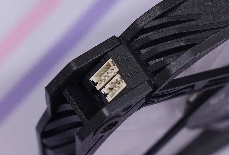 그리고, 시작과 앞서 제품 사양표기에서 확인했듯이 Shark Force 160 ARGB는 팬 사이즈 그러니깐 날개부분의 지름이 160mm입니다. 하지만, 장착 부분이 나사-홀 간의 거리는 12.5mm로 이는 140mm 팬의 나사-홀 간의 거리와 같습니다. 그래서, 장착 규격은 140mm 기준이지만 팬 사이즈는 160mm로 PC케이스에 케이스 팬으로 사용하기에는 매우 효율적이라 할 수 있죠. 그리고, 한쪽 모서리 측면에는 커넥터 2개가 적용되어 있는데, 앞서 구성품에서 확인한 팬 케이블과 ARGB 케이블이 연결되는 커넥터로 FAN와 LED라고 구분표기가 되어 있습니다. 또한, 나사홀 주변에는 앞뒤로 방진패드도 적용되어 있죠.