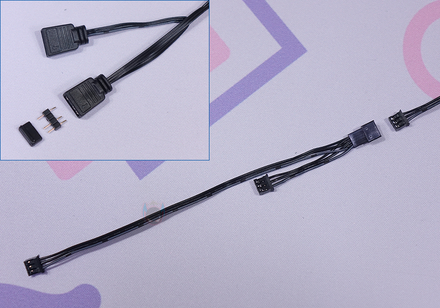 끝으로, 제공되는 분리형 케이블 2개를 살펴보면, 먼저 팬 케이블 같은경우에는 연장 케이블까지 적용되어 있어서 하나의 케이블에 팬 2개까지 연결이 가능하고, 작동 연결방식은 PWM(4 Pin)입니다. 그리고, ARGB 케이블 역시 연장 케이블이 적용되어 있어서 2개까지 연결이 가능하고 암/수 어댑터도 있어서 구분 없이 연결할 수 있죠. 또한, 메인보드 5V RGB 헤더와 연결하는 커넥터 부분 역시 Y자식으로 다른 ARGB와 연결해서 메인보드에 연결할 수 있습니다.
