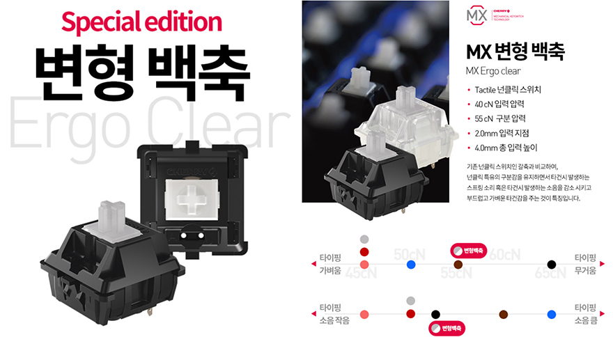 이번에 출시한 체리 KC200 MX 기계식 키보드는 기존의 체리 키보드와는 다른 분위기를 보여줍니다. 특히, 기존 제품들은 색상에서 심플한 모습을 많이 보여줬는데, 이번 KC200 MX 모델은 투톤-컬러 키캡을 적용했고, 키 스타일도 비키-스타일로 갖추면서 최근 경쟁사들에서 볼 수 있는 키보드 스타일을 갖추고 있습니다. 여기에 스위치 역시 체리로써 매우 이례적으로 변형된 스위치를 적용한 변형 백축이라는 Ergo Clear라는 스위치를 적용했죠. 사실 이런 스타일의 체리 키보드는 그동안 중국시장에서 많이 볼 수 있었는데, 이제는 글로벌시장 제품으로 확대되는 게 아닐까 추측해 봅니다. 그동안 심플한 체리 키보드가 심심하게 느껴졌던 소비자라면 확실히 이례적인 모습을 갖춘 KC200 MX 모델을 한 번 눈여겨보길 바랍니다. 그럼, 이상으로 마치겠습니다.