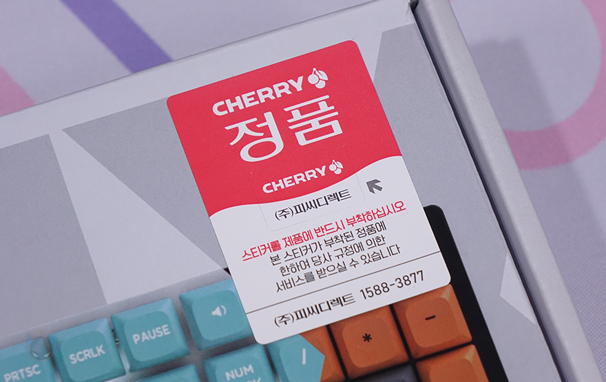 체리 키보드하면 제품박스부터 한결같이 고정적인 블랙박스를 많이 볼 수 있는데, 이번 KC200 MX 제품은 제품박스부터 기존 제품들과 다르다라는게 한눈에 들어오죠. 모델명과 함께 제품 이미지를 담고 있는데, 한눈에 키-캡에 따라 3가지 컬러로 출시했다는 걸 짐작할 수 있는데, 이 부분은 국내 출시 제품과 조금 다른 점이 있어서, 뒤에서 다시 한번 언급하겠습니다. 그리고, 국내출시는 당연히 공식수입사인 피씨디렉트에서 맡고 있기 때문에 정품스티커도 확인할 수 있죠.
