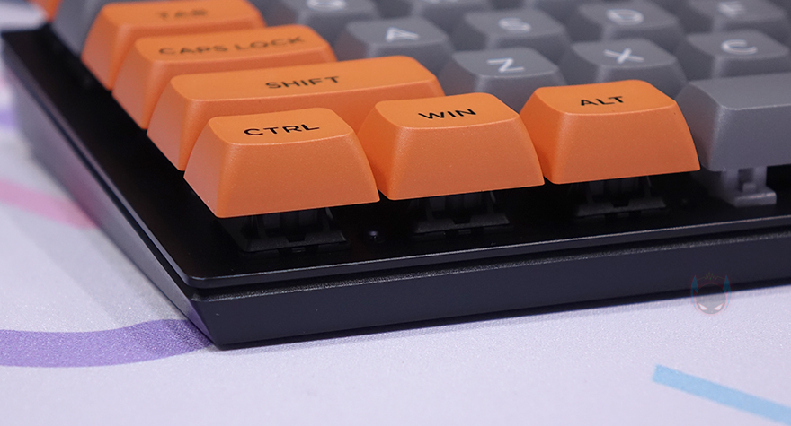 여기에 총 키수도 108 키를 가져 일반적인 104 키 풀-배열보다 4개의 키가 추가되었는데, 4개의 키는 숫자-키패드 위에 배치되어 있죠. 기능은 볼륨 조절과 음소거, 윈도우 운영체제의 계산기 프로그램 실행입니다. 그리고, 키캡은 앞서 확인했듯이 투톤 컬러로 적용되었으며, PBT 이중사출 방식이죠. 스위치 같은 경우에는 변형 백축이라고 부르는 Ergo Clear 스위치로 체리 백축 스위치의 스프링을 흑축 스위치의 스프링으로 교체한 스위치입니다. 또한, 스프링만 교체한 게 아니라 윤활처리까지 모두 적용되었죠. 그래서, 키압은 갈축 느낌을 주면서 소음은 적축에 가까운 특징을 가졌습니다. 여기에 스위치 방향도 체리 문구가 정방향으로 보이게 장착되었죠. 스테빌라이저는 당연히 체리식입니다.