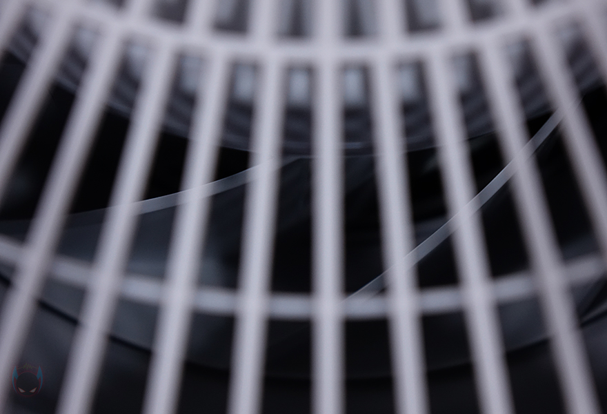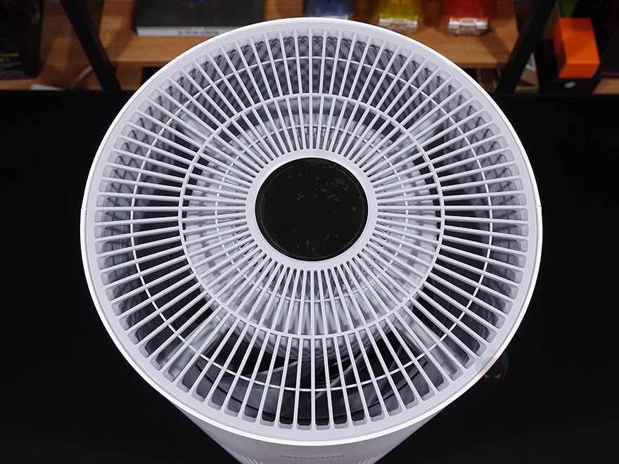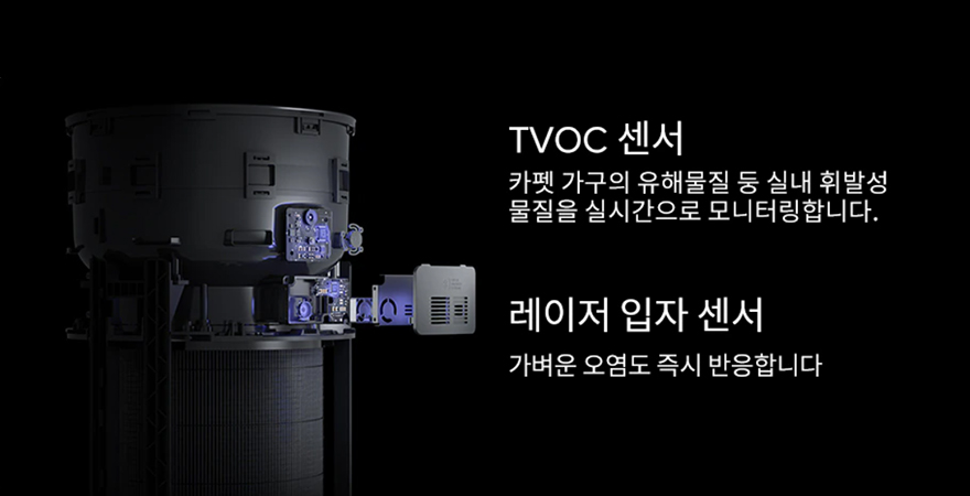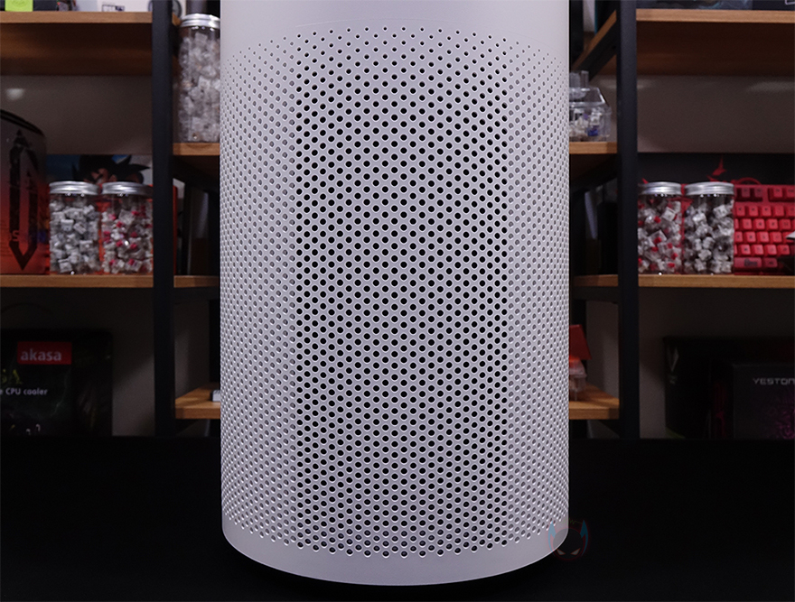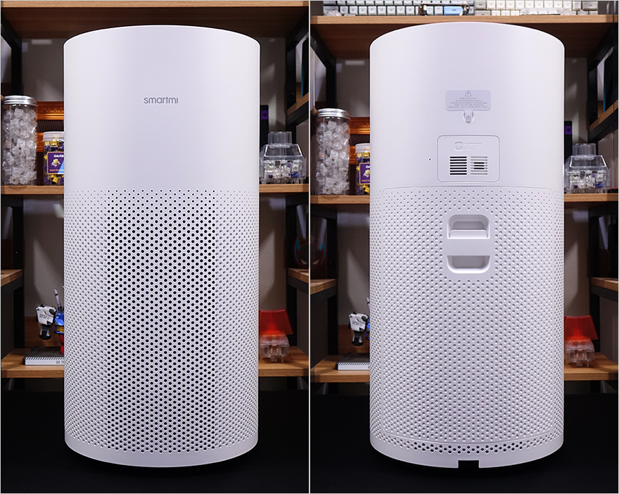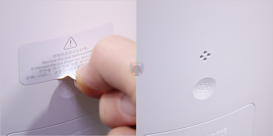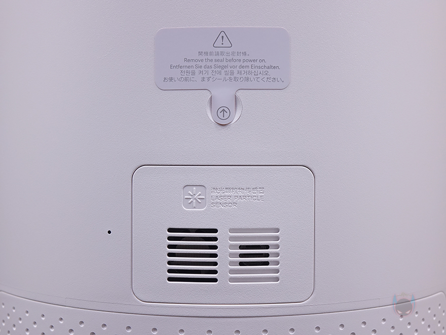 Air Purifier 공기청정기 모델을 좀 더 자세히 살펴보면, 전면에는 심플하게 로고(Logo)를 새겨놨으며, 중간위치부터 아래까지는 원통 둘레 모두 타공망 처리로 360˚ 외부 공기가 흡입되도록 했으며, 후면 윗부분에는 휘발성 물질을 감지하는 TVOC 센서와 오염도를 측정하는 레이저 입자센서가 위아래 각각 배치되어 있습니다. 앞서 안내문구에서 확인했듯이 TVOC 센서는 개봉 시 씰(seal)이 붙어있기 때문에 사용 전 떼어내야 합니다. 그리고, TVOC센서 바로 아래에는 뒤에서 확인하겠지만, OLED 디스플레이 화면밝기 버튼이 배치되어 있죠.