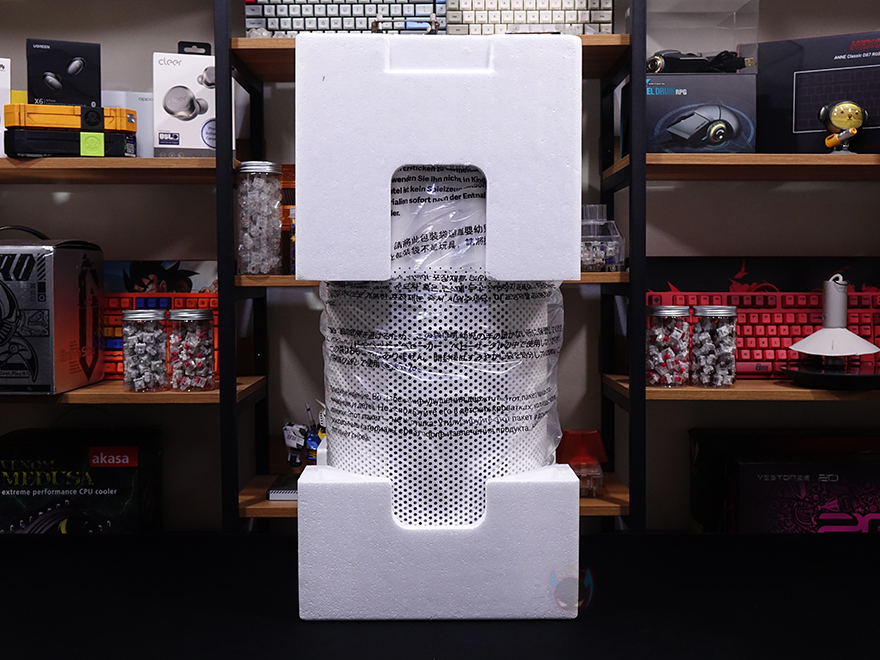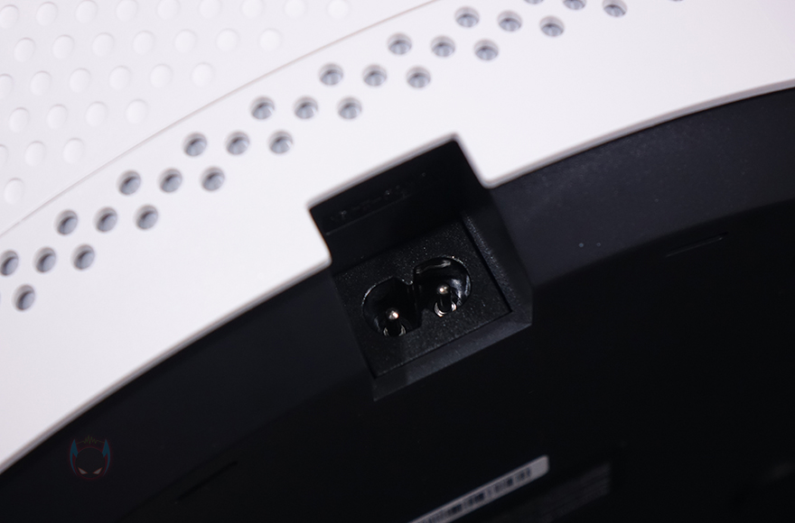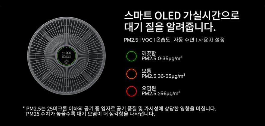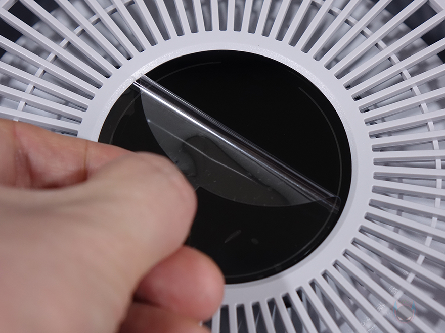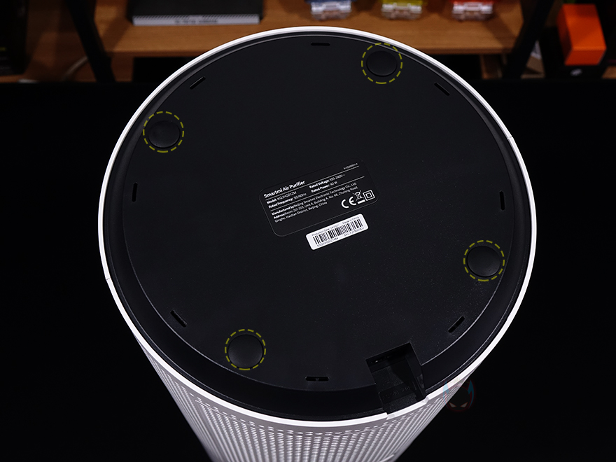후면 맨 아래에는 전원케이블과 연결되는 포트가 배치되어 있으며, 제품 밑바닥에는 미끄럼방지 및 진동 소음 최소화를 위해 고무 패드를 4개 부착해 놨습니다. 그리고, 제품 맨 상단에는 정화된 공기가 배출되게 에어홀 처리가 되어 있으며, 중앙에 OLED 디스플레이가 적용되어 있습니다. 가까이에서 보면 내부에 팬이 적용되어 있는 것을 확인할 수 있죠. 또한, 개봉 시에는 OLED 디스플레이에 보호비닐이 부착되어 있습니다. 끝으로, 전원케이블은 총 1.5m 길이를 가졌습니다.