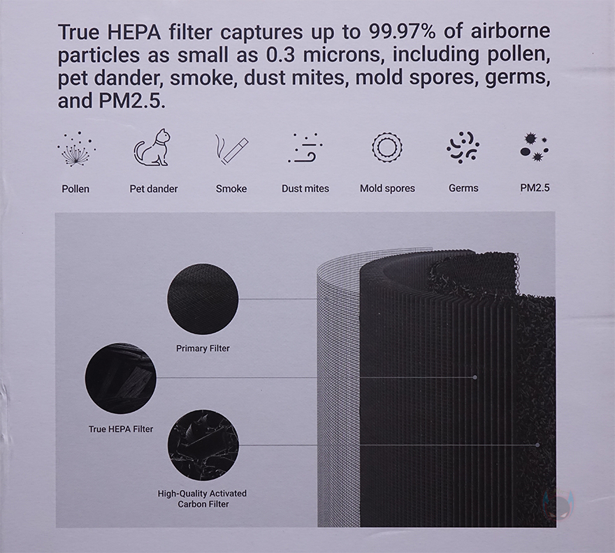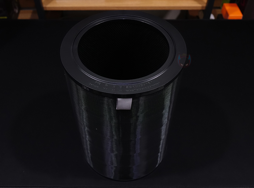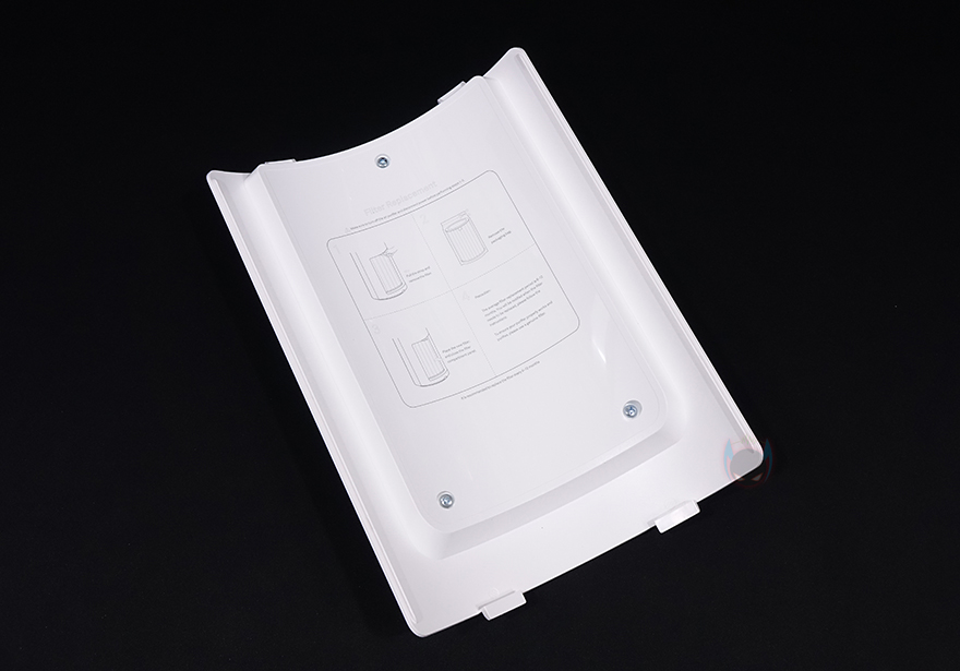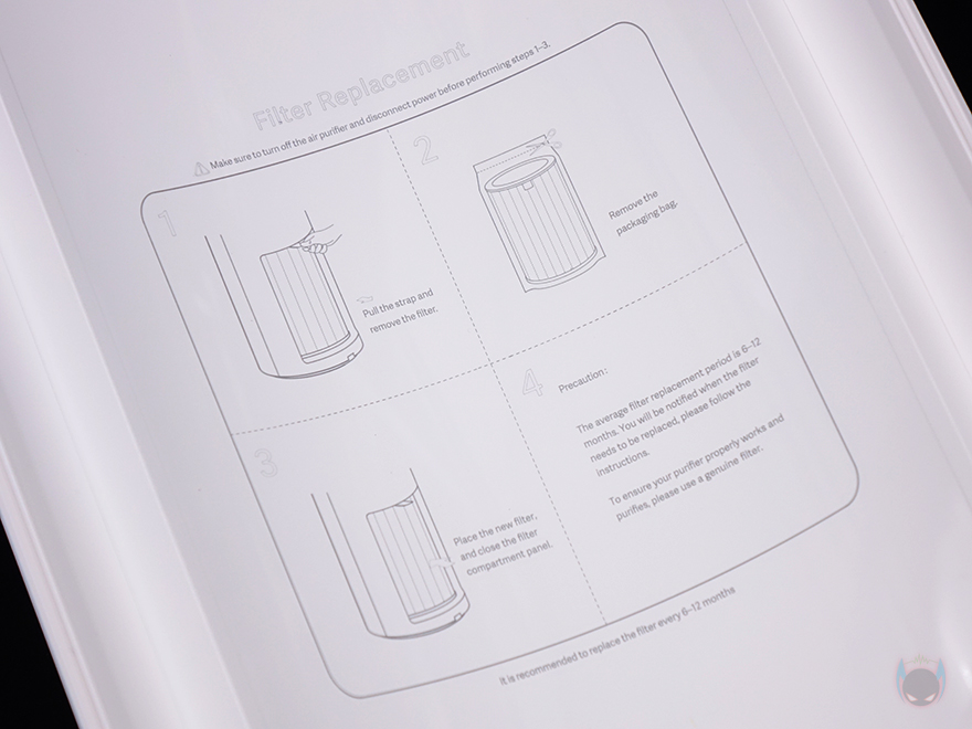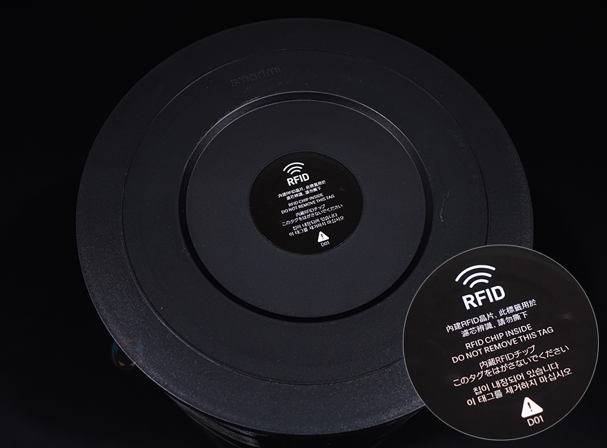 후면 아래에는 내부 필터가 장착되는 공간으로 외부에서 타공망 커버 윗부분에 있는 손잡이 부분을 누르면 쉽게 커버를 분리할 수 있습니다. 그리고, 커버 안쪽에는 필터 교체법에 대한 내용도 담고 있어서 처음 필터를 교체할 때 참고하면 좋습니다. 내부에 장착된 필터는 H13 헤파(HEPA) 필터로 필터 바깥쪽에 망 같은 1차 필터가 있으며, 그 안에 나노미터(nm)까지 필터 해주는 리얼 필터가 있고, 맨 안쪽에 오염물집을 걸러주는 활성탄이 적용되어 있는 구조입니다. 필터는 6~12개월 주기로 바꿔주는 걸 권장하고 있으며, 알리익스프레스 공식 스토어에서 구입할 수 있습니다. 그리고, 필터 밑바닥에는 RFID가 적용되어 있다는 제거방지 문구도 확인할 수 있습니다.