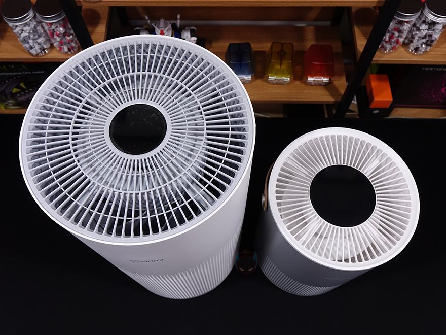 스마트미(Smartmi) Air Purifier 공기청정기를 본격적으로 살펴보면, 앞서 언급한 대로 원통형 디자인으로 크기는 지름 260mm에 높이 535mm 가졌으며, 자사의 소형 모델인 Air Purifier P1과 비교하면 확실히 크기가 있어서 기본적으로 방보다는 거실위주의 공기청정기 콘셉트이라는 걸 짐작할 수 있습니다. 참고로, Air Purifier P1이 지름은 작지만, 상단에 배치된 OLED 화면은 더 큽니다.