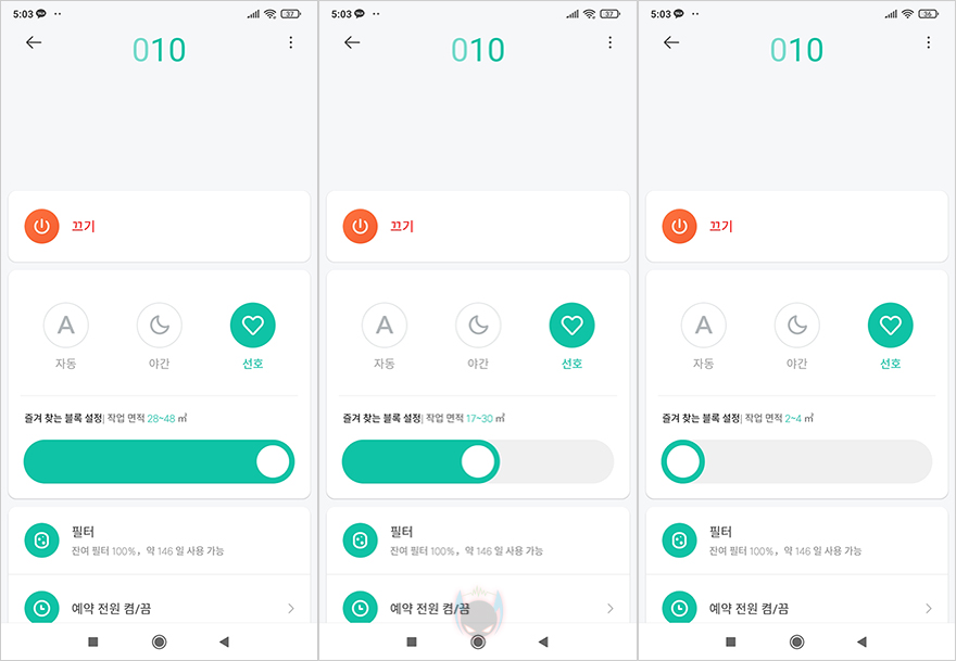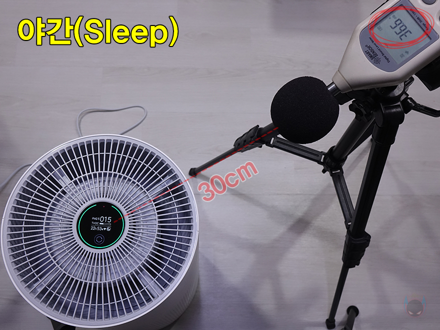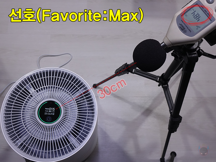 그리고, 앞서 언급했듯이 모드 중에 선호(Favorite) 모드는 방 면적에 따라 공기정화율을 조절할 수 있는데, 최대 48㎡부터 최소 2㎡까지 설정할 수 있습니다. 면적에 따라 팬 작동속도가 조절되죠. 그래서, 직접 야간(Sleep) 모드와 선호모드에서 가장 최고 설정인 48㎡ 설정에서 작동 시 팬 소음을 측정해 봤는데, 30cm 거리를 두고 측정한 결과 야간(Sleep) 모드는 약 36dB(A), 선호 모드 최대설정에선 약 48dB(A) 수준으로 야간모드는 정말 수면에 방해되지 않게 조용했으며, 선호 모드는 소음이 발생하지만 역시 귀에 심하게 거슬릴 정도가 아니라서 큰 불편함은 없었습니다. 실제로 생활소음기준값과 비교해봐도 소음이 높은 편은 아니라는 걸 알 수 있죠. 그리고, 두 모드에서 각각 소비전력도 측정을 해봤는데, 야간 모드 같은 경우에는 3.7w 수준으로 매우 낮았으며, 선호 모드 최대 설정도 불과 40w 수준에 불과해 소음과 소비전력 모두 소비자입장에선 부담스럽지 않다 할 수 있습니다.