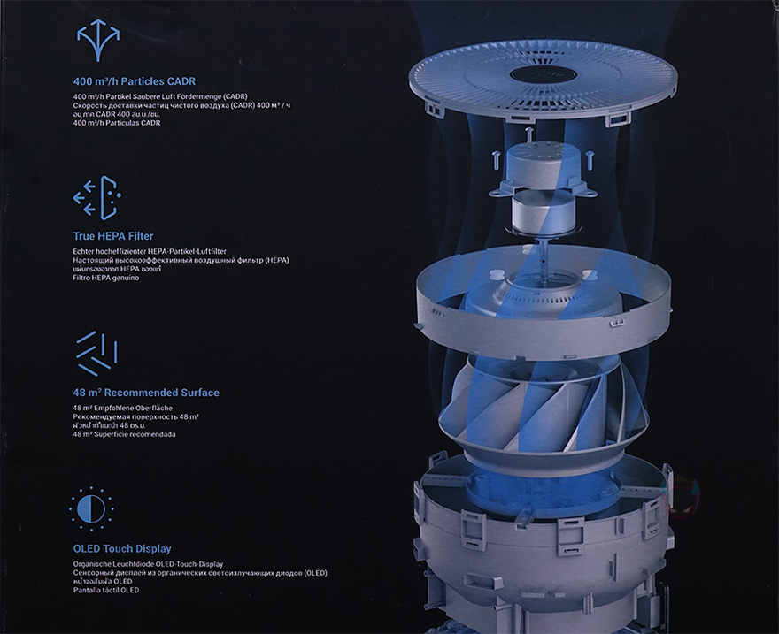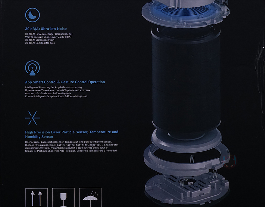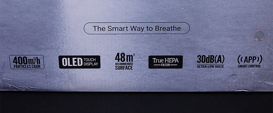 뿐만 아니라 박스 측면에 보면 OLED 디스플레이의 터치방식과 더불어 제스처 제어인식까지 지원한다라는 걸 미리 알 수 있고, 99.97%의 헤파 필터 사용으로 먼지, 연기, 잡냄새 등 정화를 비롯해 반대쪽 측면에는 방금 언급한 특징들을 제품 구조 이미지와 함께 상세하게 표기하고 있습니다. 또한, 제품 구입 시 혹은 보관 시 이동 편의를 위해 박스 손잡이도 적용되어 있죠.
