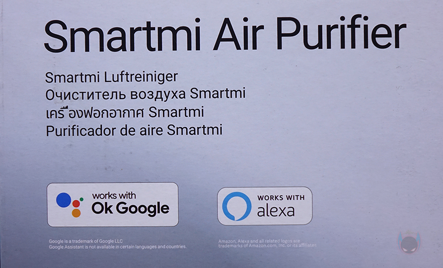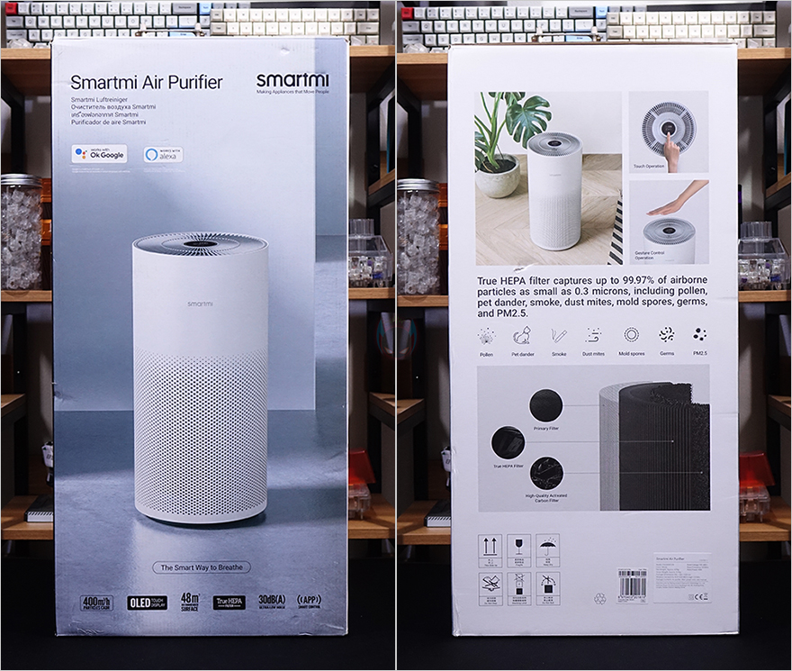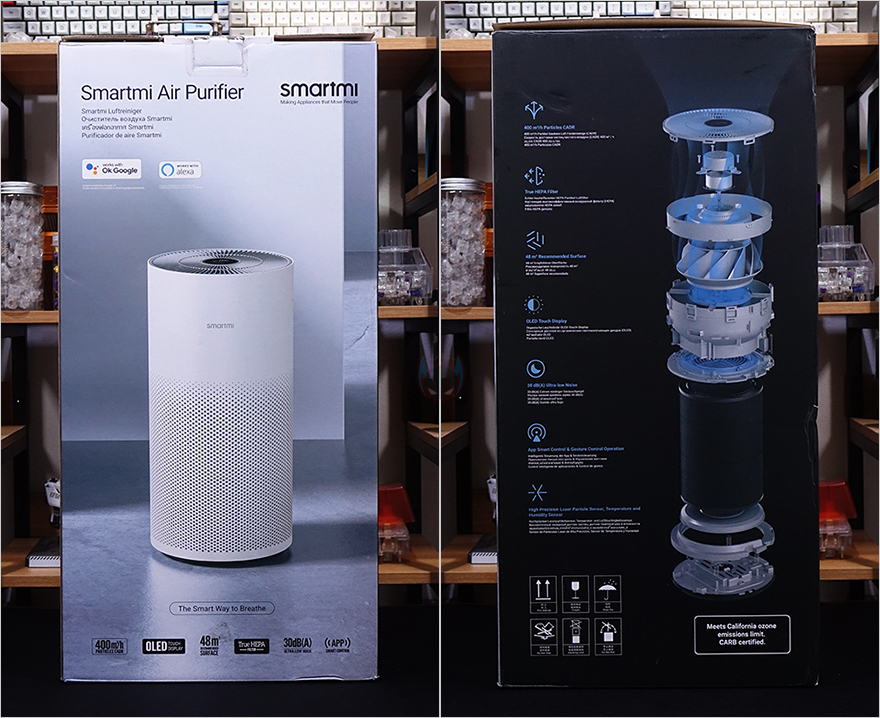 공기청정기 제품들은 일반적으로 제품 박스가 길죠. 스마트미(Smartmi) Air Purifier 모델 역시 제품박스가 깁니다. 그리고, 박스 전후면에 제품 이미지를 담고 있어서 원통형 디자인이라는 것도 미리 알 수 있죠. 또한, 이 모델은 스마트미의 첫 번째 공기청정기 모델로 출시한지 2~3년 정도가 되었지만, 모델명 아래에 표기된 것처럼 첫 모델부터 구글 어시스턴트, 아마존 알렉사 음성 서비스 연동 지원까지 갖추고 있습니다. 이외에도 공기정화율면적(PCADR), OLED 디스플레이, 실내 면적, 낮은 소음, 어플 지원을 주요 특징으로 표기해 놨죠.