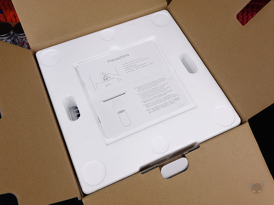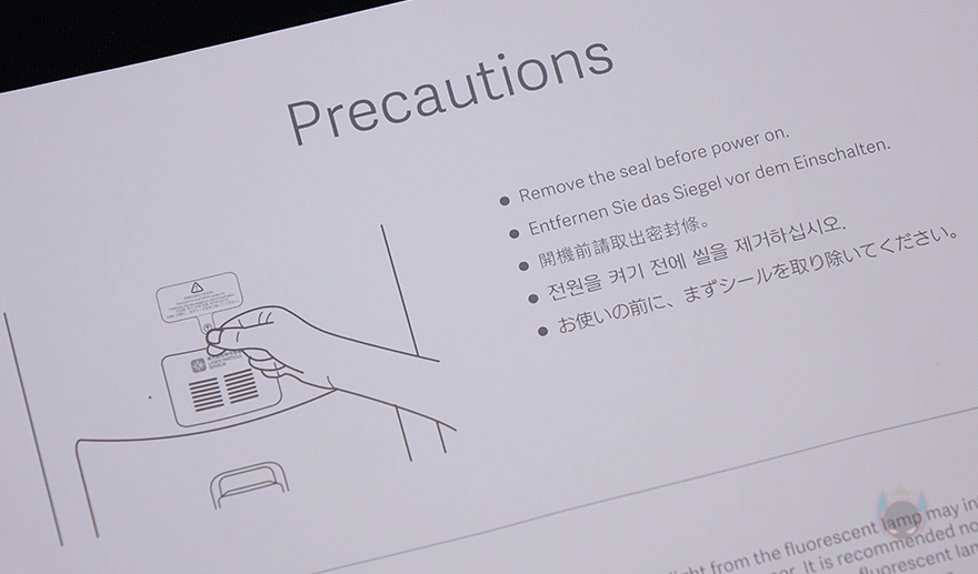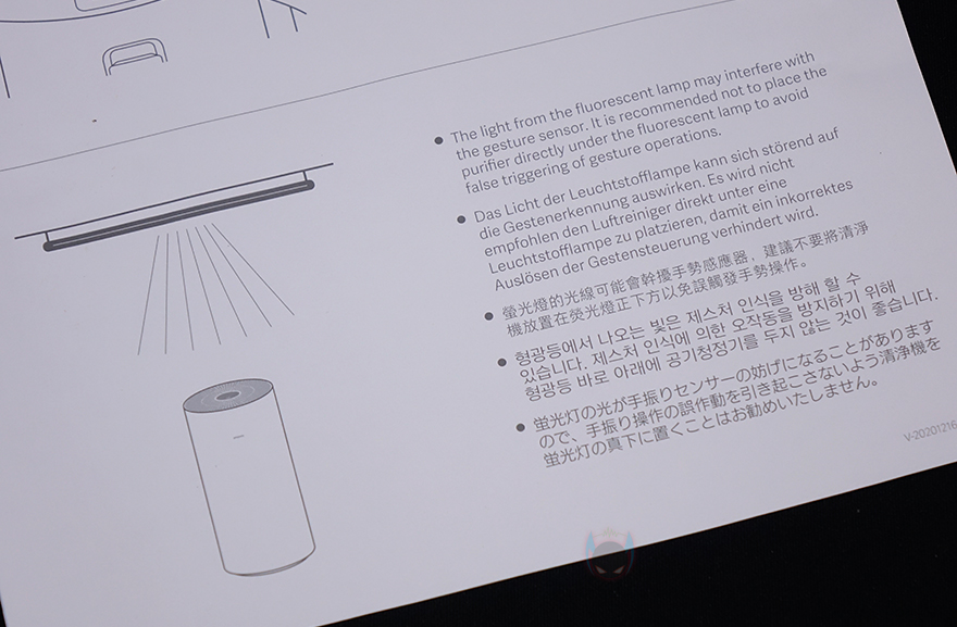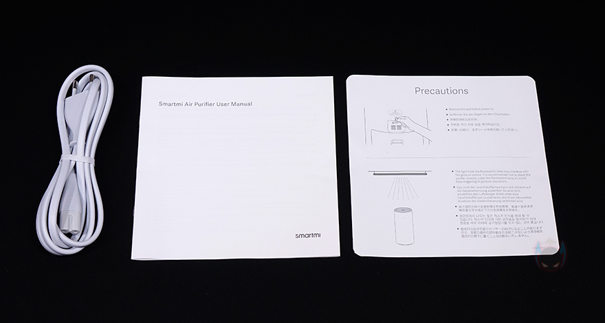 박스를 열어보면, Air Purifier 공기청정기는 기본 비닐포장에 외부 충격방지를 위해 스티로폼 포장재가 사용되었으며, 부속품에는 전원케이블, 제품설명서, 안내문구가 들어있는데, 안내문구는 사용 전 센서 씰 제거와 조명빛에 따른 인식오류 발생에 대한 언급이라 꼭 사용 전에 참고하면 좋습니다.
