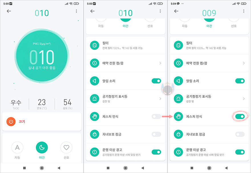 그리고, 스마트미 Air Purifier 공기청정기 역시 어플 지원을 해주고 있는데, 다만 이 모델은 스마트미의 첫 번째 모델이다 보니 이후 출시한 Smartmi Link 어플을 지원하는 게 아니라 샤오미 Mi Home 어플을 지원하고 있습니다. 그래서, 공기청정기 전원을 켜면 바로 페어링 모드가 시작되고, 샤오미 Mi Home 어플에서 기기추가 검색을 하면 기기가 바로 검색되고 선택해주면 연결이 되죠. 방설정까지 마치고 나면, 어플 화면에서 실내공기 상태부터 모드 전환, 필터교체시기, 알림 소리, 표시등, 제스처 인식, 자녀보호 잠금 등의 부가기능들 확인할 수 있습니다. 특히, 제스처 인식을 하면 전원을 켤 때를 제외하고 OLED 디스플레이에 직접 터치하지 않고 20cm 거리 안에서 제스처로 모드전환과 전원 끄기를 할 수 있습니다.