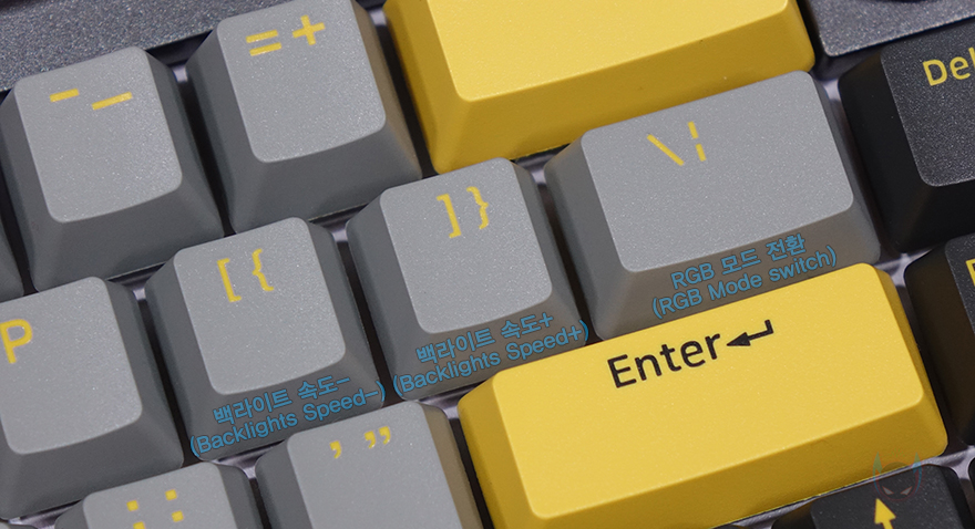 키-캡(Keycaps)은 PBT재질에 이중사출 방식으로 내부를 보면 완전히 100% 채워진 이중이라 두께도 약 1.5mm로 두껍죠. 여기에 개봉시 기본상태에서도 옐로우 색상의 포인트-키캡이 적용되어 있지만, 추가 교체용 포인트 키-캡도 제공해주고 있어서 교체하면 블랙과 그레이 색상으로 좀 더 투톤-컬러에 맞출 수 있습니다.