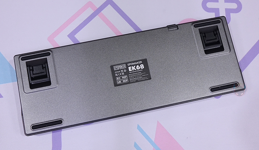 EK68 키보드의 스위치는 총 3가지로 출시되었는데, 색상에 따라서 1가지가 다릅니다. 기본적으로 게이트론 G Pro 2.0 황축과 Epomaker의 커스텀 스위치인 플라밍고(Flamingo) 리니어 스위치는 색상구분 상관없이 공통으로 선택할 수 있으며, 나머지 1가지는 Epomaker의 커스텀 스위치로 블랙골드 색상으로 선택하면 버저리가(Budgerigar) 택타일 스위치를 선택할 수 있고, 블랙퍼플 색상을 선택하면 블루버드(Bluebird) 리니어 스위치를 선택할 수 있죠. 리뷰에 사용된 스위치는 버저리가(Budgerigar) 스위치로 체리 스위치 기준으로 보면 갈축에 해당하는 택타일(Tactile)이며, POM 스템을 사용해 갈축보다 좀 더 걸리는 느낌이 확실하면서 특유의 탄력성을 가져 좀 더 쫀득한 체감을 줍니다. 그리고, 스테빌라이저는 체리식이며, 스페이스-바 키-캡을 분리하면 보강판 아래에 흡음재(Sound Absorption Foams)가 사용된 것을 쉽게 확인할 수 있죠.