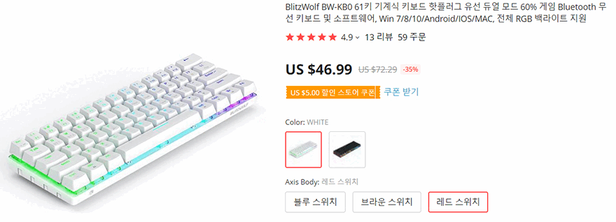 Blitzwolf(블리치울프)의 BW-KB0 키보드는 시작에서 잠깐 언급했듯이 블리치울프의 두 번째 키보드, 정확히는 미니 키보드로써 두 번째 모델입니다. 블랙과 화이트 2가지 색상으로 나오고, 61키를 가진 미니 키보드로 유선과 무선 블루투스 둘 다 갖추고 있죠. 요즘 미니 키보드에서 많이 볼 수 있는 형태입니다. 그래서, 조금은 식상하다 느낄 수 있지만, 기계식 미니 키보드가 대체적으로 비싼 경우가 많다라는 점에서 이 BW-KB0는 기본적인 요소들만 갖추면서 가격을 나름 저렴하게 구성해서, 기계식 키보드에서 미니 키보드로 입문하고 싶다면 추천해 줄 수 있는 제품입니다. RGB 조명도 20가지를 갖추고 있고, 핫-스왑 스위치까지 갖추고 있기 때문에 사용하면서 추후 사용자가 커스텀으로 교체할 수 있는 부분도 있죠. 그럼, 이상으로 마치겠습니다.