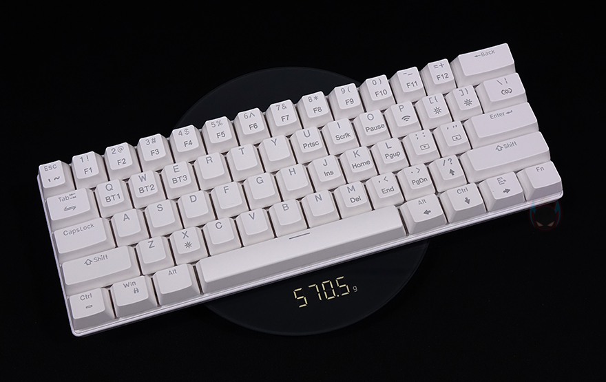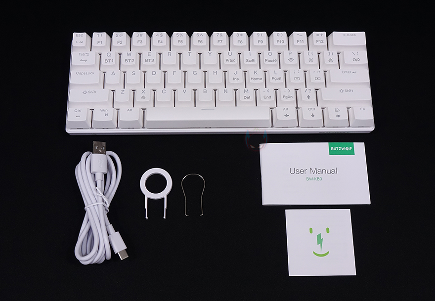 Blitzwolf BW-KB0 키보드를 본격적으로 살펴보면, 색상은 화이트와 블랙 2가지 색상으로 출시되었으며, 풀-배열 키보드 기준에서 딱 영문 자판 및 엔터키가 배치된 부분만 그대로 드러낸 형태의 총 61 키 미니키보드 형태입니다. 물론, 다른 미니키보드처럼 한쪽에 방향키를 담고 있죠. 그리고, 미니키보드인 만큼 길이도 약 29cm로 짧으며, 무게도 약 570g으로 키보드에선 비교적 가벼운 편에 속합니다.