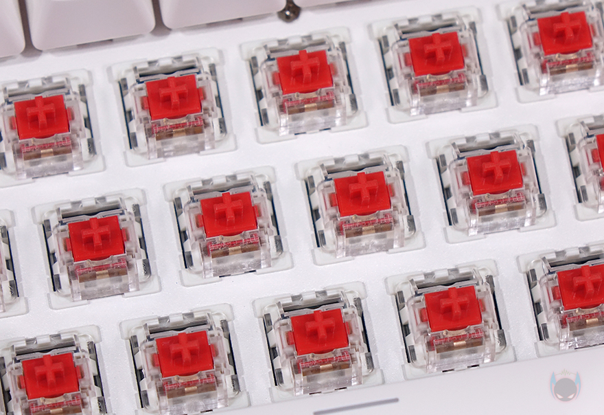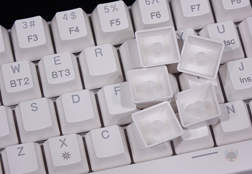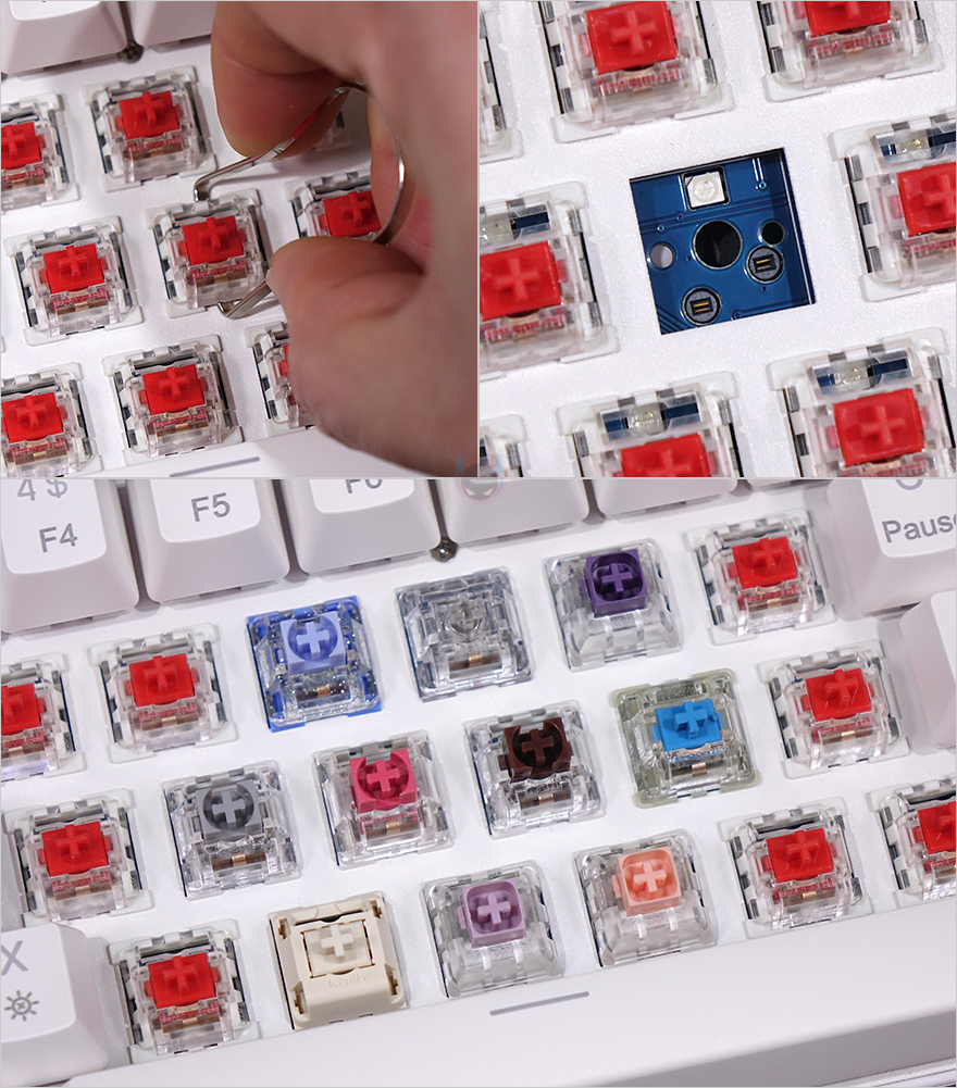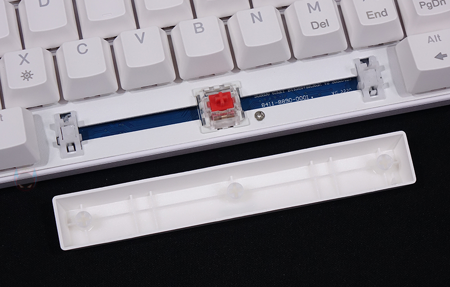 키-캡은 ABS 재질에 이중사출 방식이며, 키-캡 폰트 문구 중 하단을 제외한 상위 폰트들은 모두 RGB 조명효과를 투과합니다. 그리고, 스위치는 오테뮤(OUTEMU)사로 앞서 제품박스에서 확인했듯이, 청축/갈축/적축 3가지 타입으로 나왔죠. 물론, 요즘 키보드답게 스위치는 사용자가 언제든지 교체할 수 있게 핫-스왑(Hot-swap) 방식으로 장착되어 있는데, 스위치를 빼내면 PCB기판에 3개의 구멍을 확인할 수 있어서, 다른 3Pin 스위치로 교체 가능합니다. 그리고, 스테빌라이저는 체리식이죠.