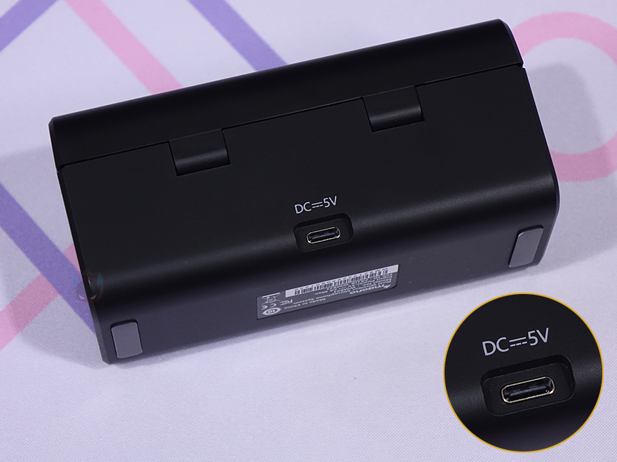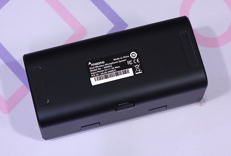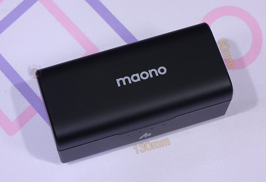 마오노(MAONO) WM821 무선 마이크를 본격적으로 살펴보면, 일단 포장 시 충전케이스(Charging case) 안에 마이크와 수신기가 수납되어 있는 상태이기 때문에 충전케이스부터 살펴보는데, 130x60mm 크기의 라운딩처리된 사각 박스형태로 충전케이스 뚜껑 부분에는 마오노 로고(Logo)를 새겨놨습니다. 그리고, 전면 그러니깐 뚜껑이 열리는 부분에는 역시 로고 표시와 함께 바로 윗부분에 충전상태를 확인할 수 있는 LED 인디케이터(Indicator)가 적용되어 있죠. 그리고, 반대쪽 후면에는 USB 충전케이블과 연결되는 USB Type-C 포트가 배치되어 있는데, 10W로 충전됩니다. 또한, 케이스 바닥 부분에는 미끄럼방지 고무 패드가 부착되어 있는데, 개봉 시에는 패드에 보호비닐도 부착되어 있기 때문에 사용 전에 제거해 주는 게 좋습니다.